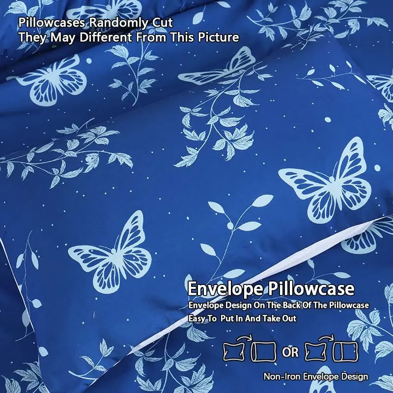 5. Blue Butterfly Print Bedding Duvet Cover Set, 3-Piece Set includes 1 duvet cover + 2 pillowcases, without inserts.Ultra soft and suitable for all seasons.The bedding is designed with a zipper closure, ideal for bedroom and guest room decoration.