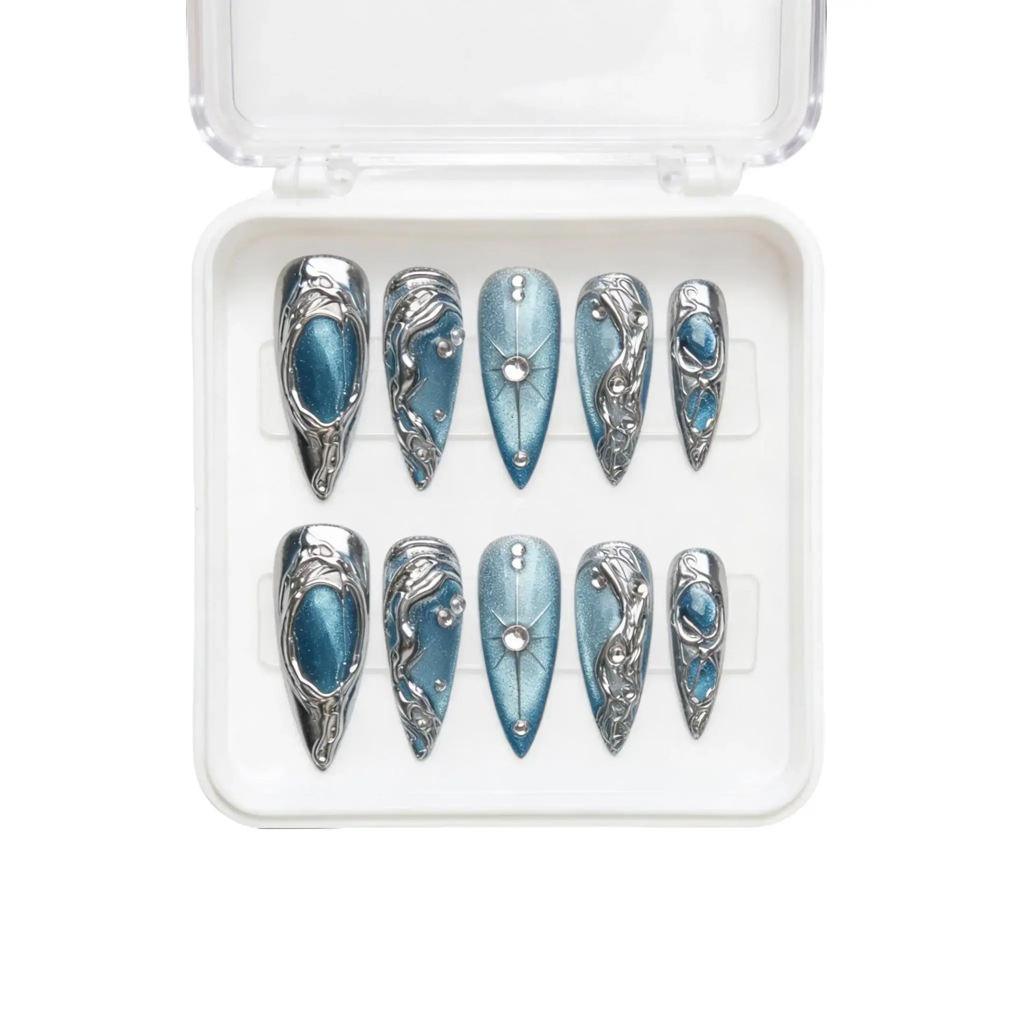 Y2K Press On Nails, Silver Chrome Cyberpunk Blue Liquid Metal Gothic, Almond Gel Tips, Reusable Manicure