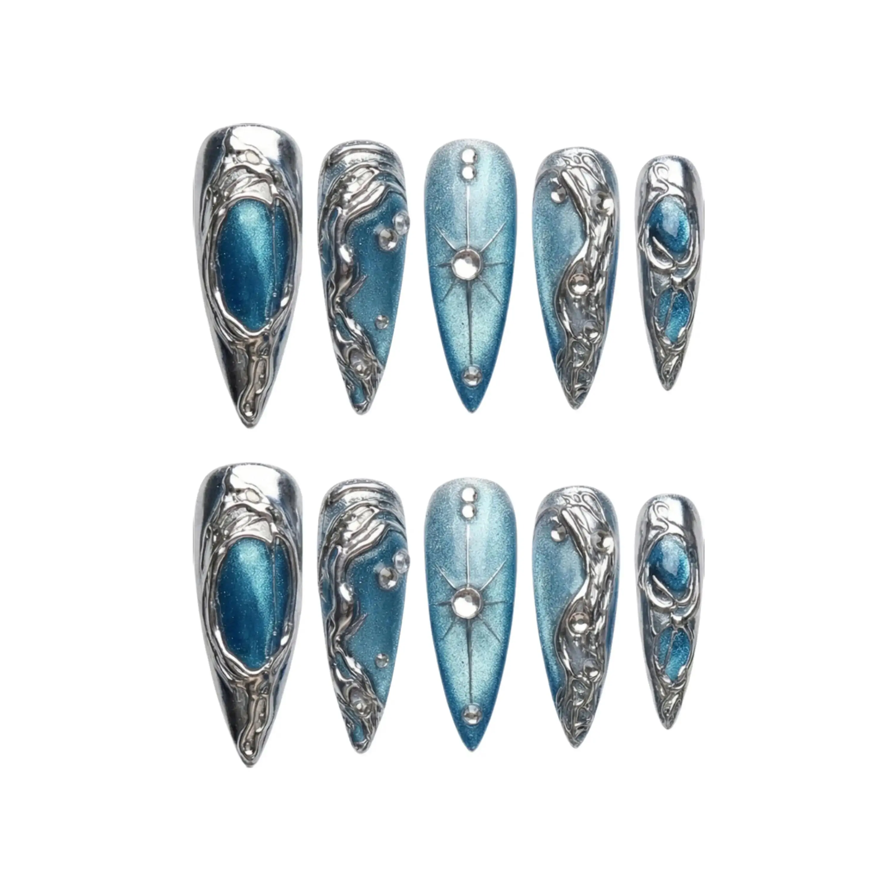 ·Silver Chrome Cyberpunk Blue Liquid Metal Gothic: These nails feature a futuristic, cyberpunk-inspired design. The silver chrome and blue liquid metal elements create a striking, gothic aesthetic. Perfect for those who love bold, edgy styles. 🌌