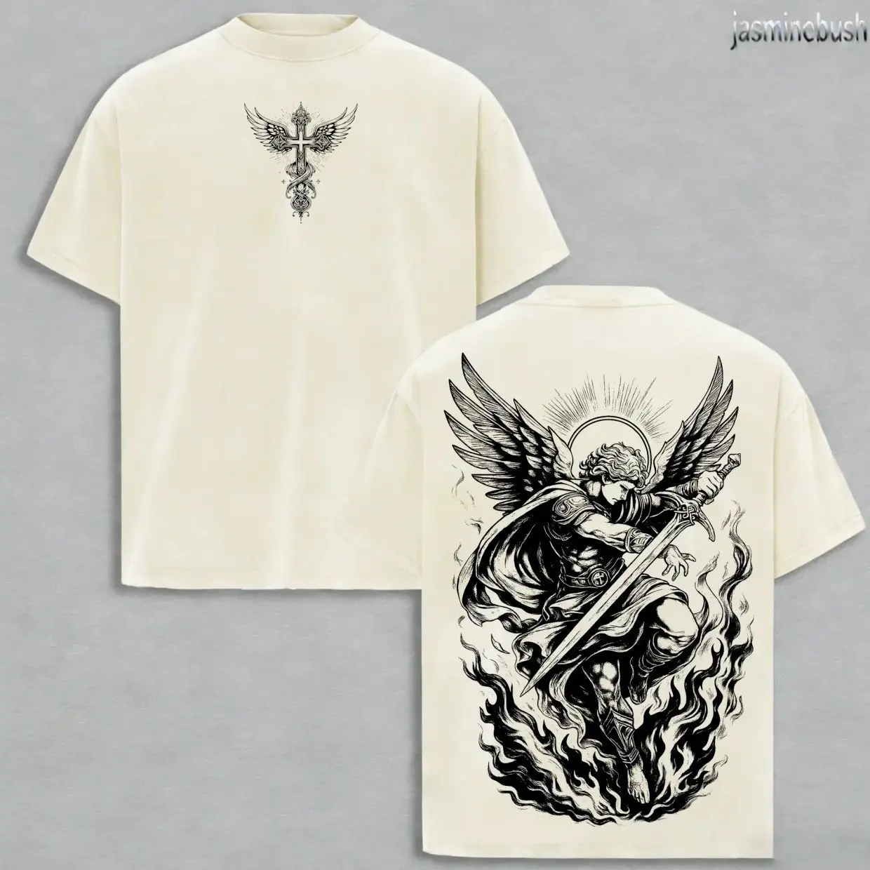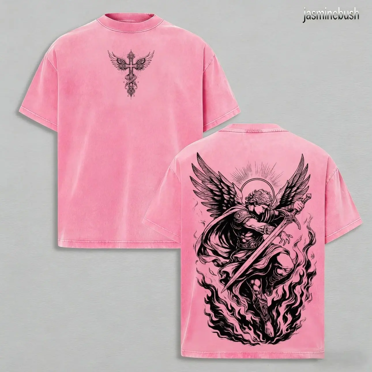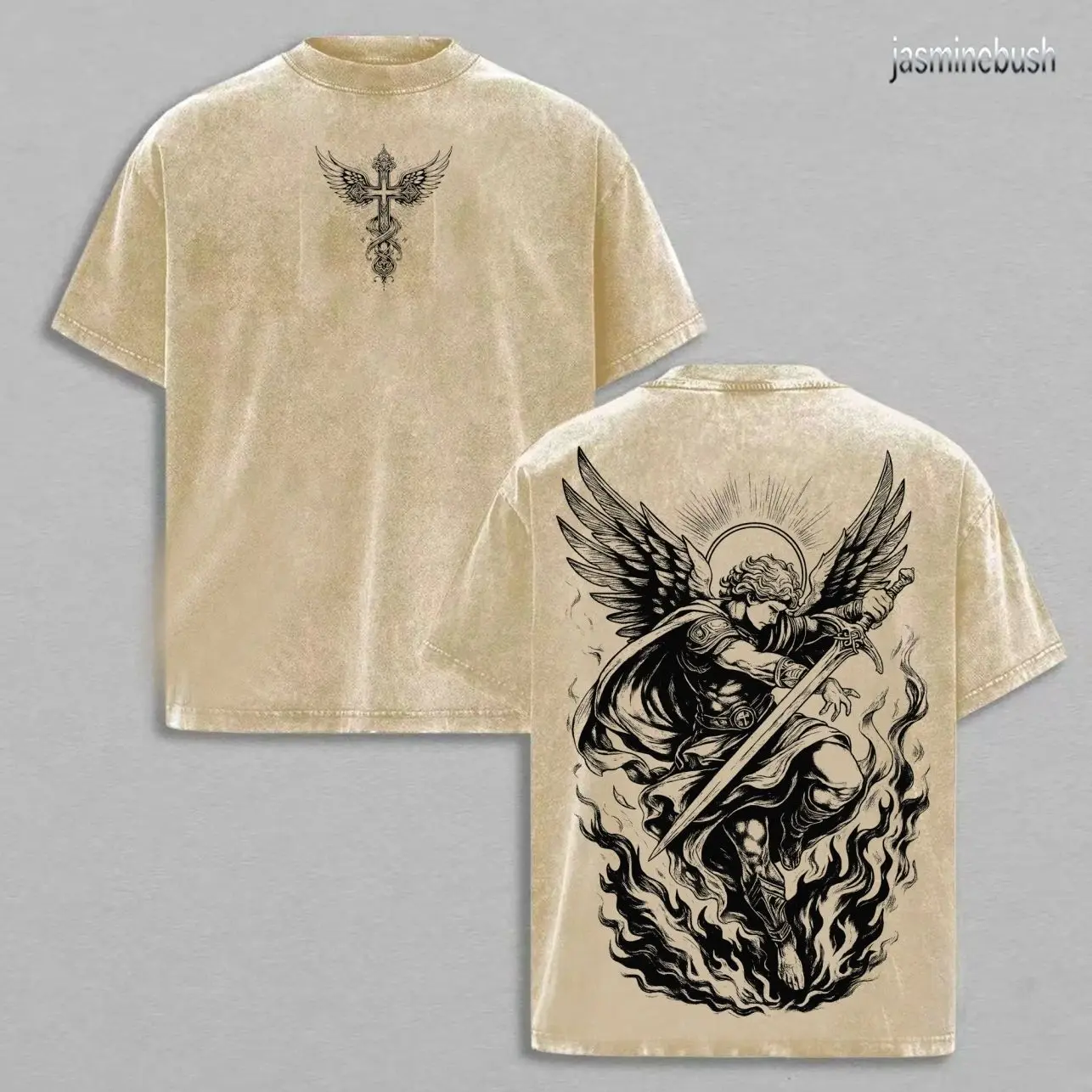 Archangel Michael Vintage Washed Oversized Christian T-Shirt, Angel of Fire Faith Graphic Tee, Heavy Cotton Dark Scripture Streetwear Top, Unisex Retro Worship Shirt for Believers 9MW