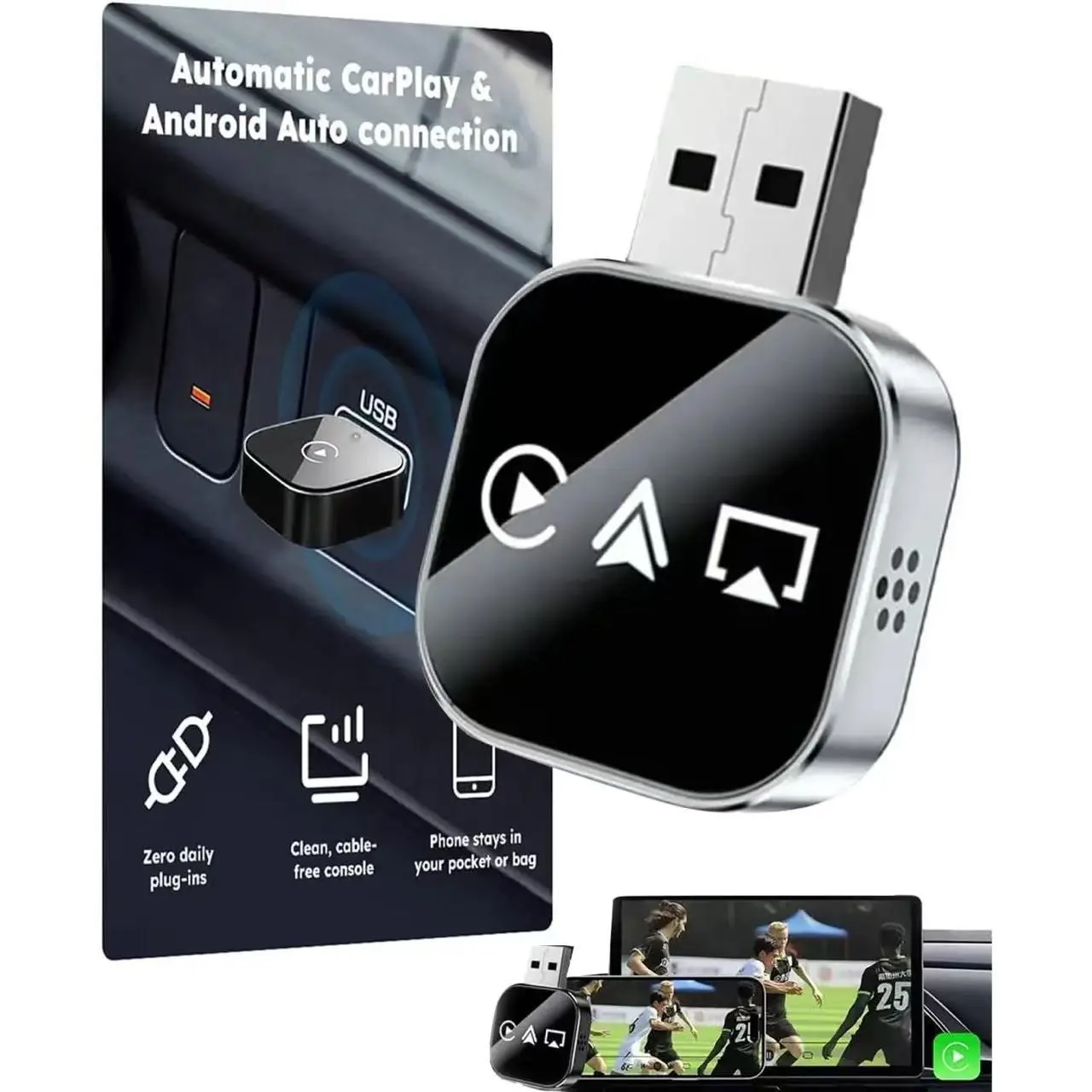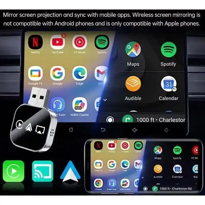 【3-in-1 Functionality】: Combines CarPlay, Android Auto, and screen mirroring in one device for versatile connectivity.