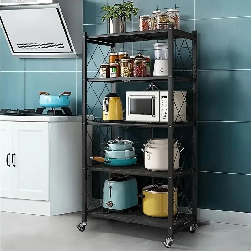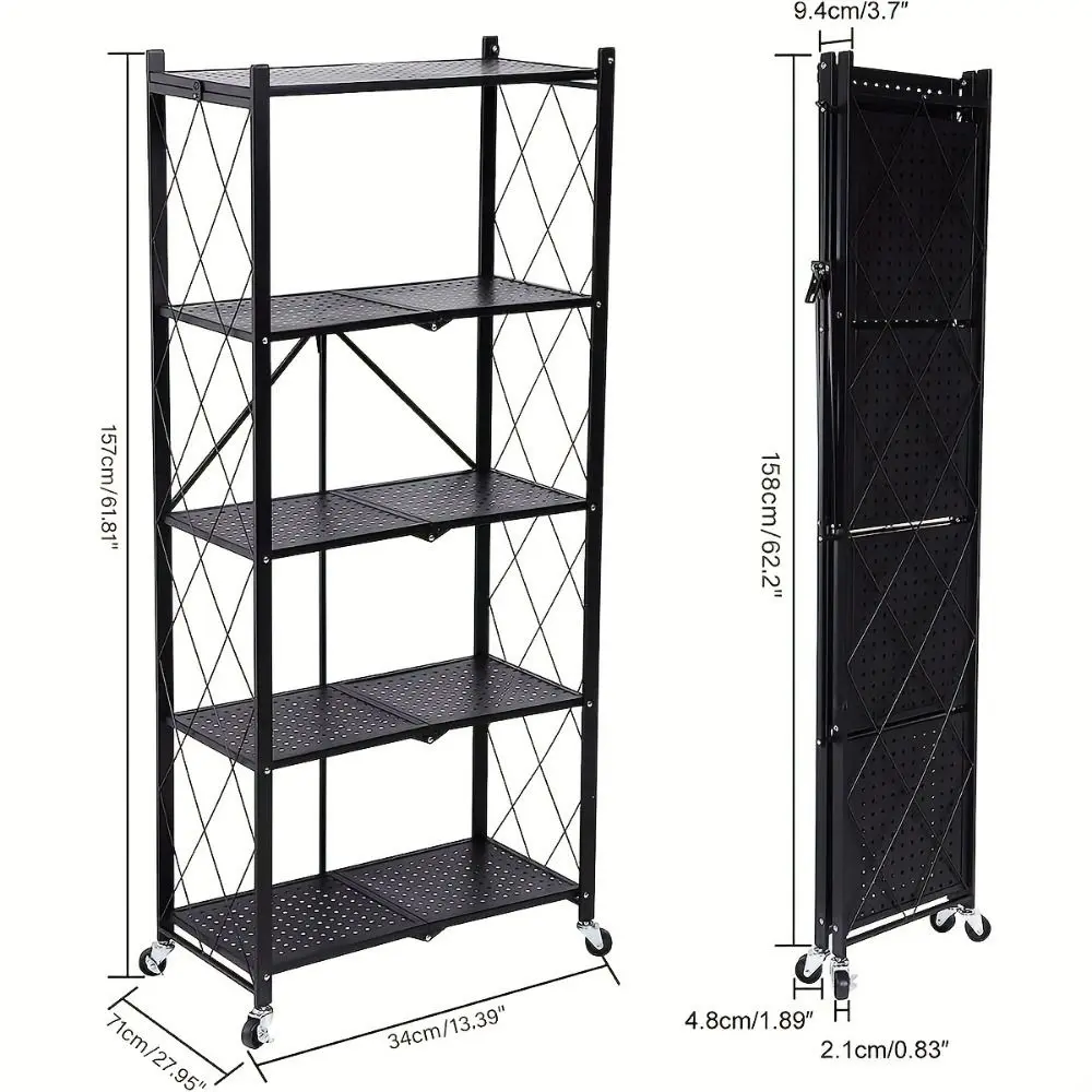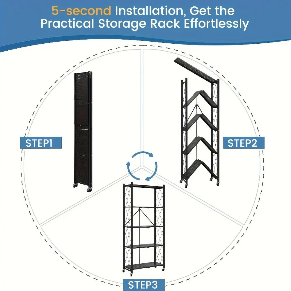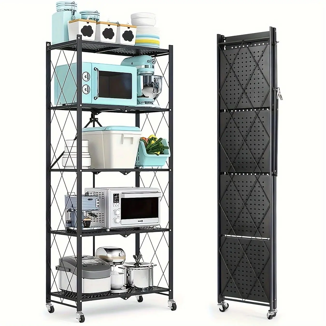 5 Tier Heavy Duty Foldable Metal Rack Storage Rack, Removable Organizing Rack with Wheels, Suitable for Garage Kitchen, Black Kitchen Storage Rack, Garage Storage Organizer Rack, All-In-One Storage Rack