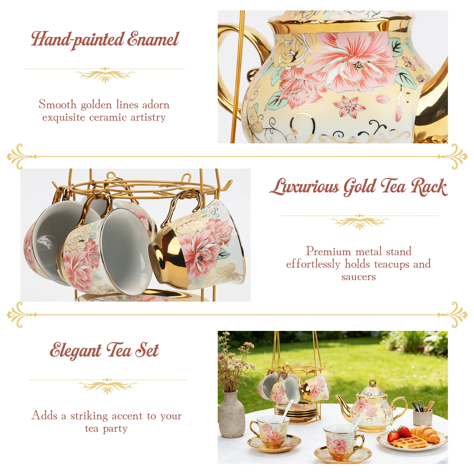 ·Versatile for any occasion: whether it’s a quiet morning at home, a garden party, or a holiday celebration, this tea set adds sophistication to every moment.