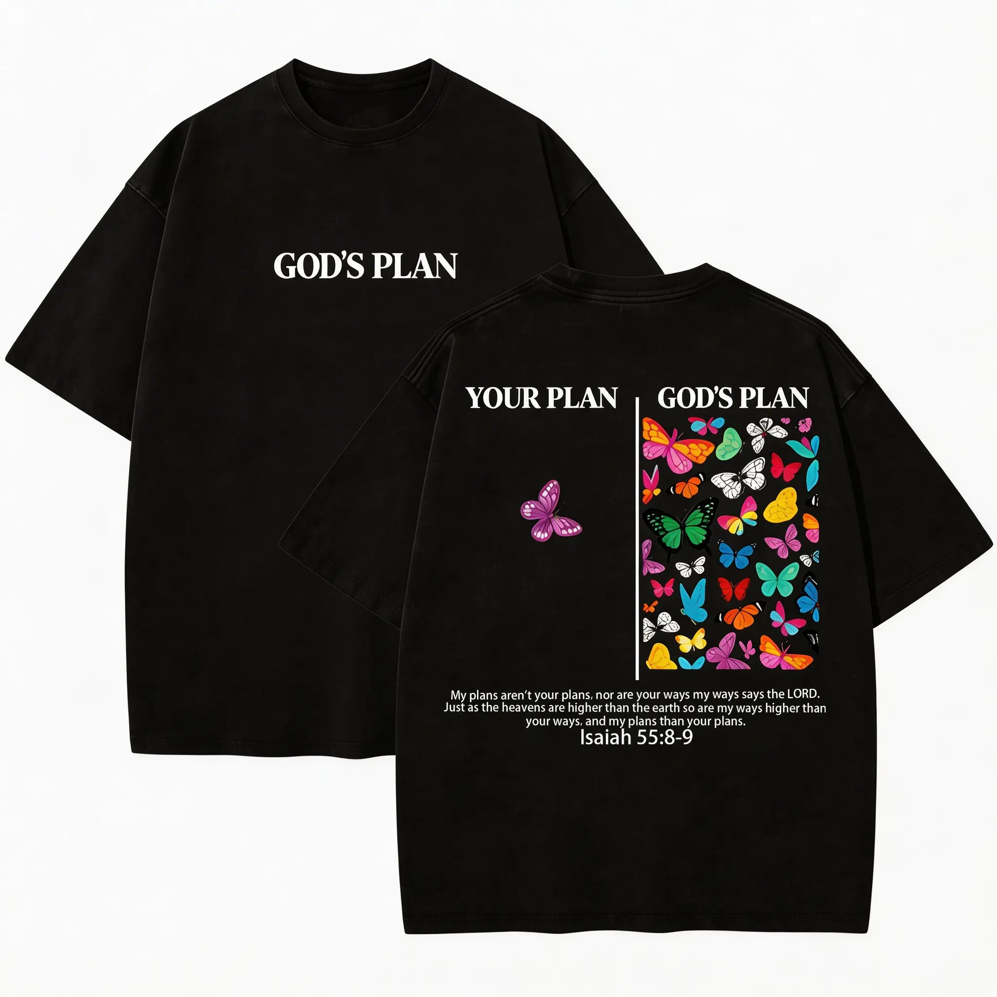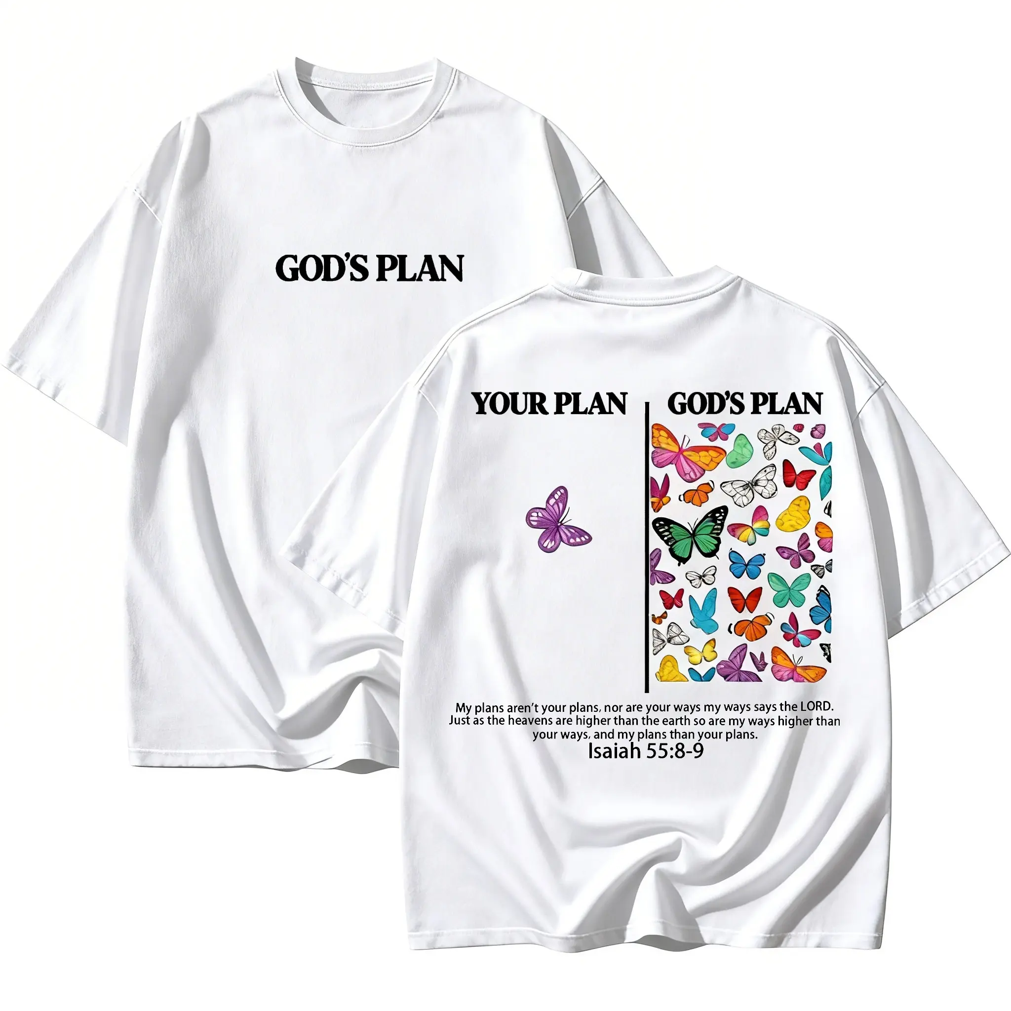 Front features a clean, minimalist print of "GOD'S PLAN".The back is divided into a contrasting panel: "YOUR PLAN vs GOD'S PLAN", paired with fresh, calming floral illustrations for rich visual layers and an understated, premium niche aesthetic.