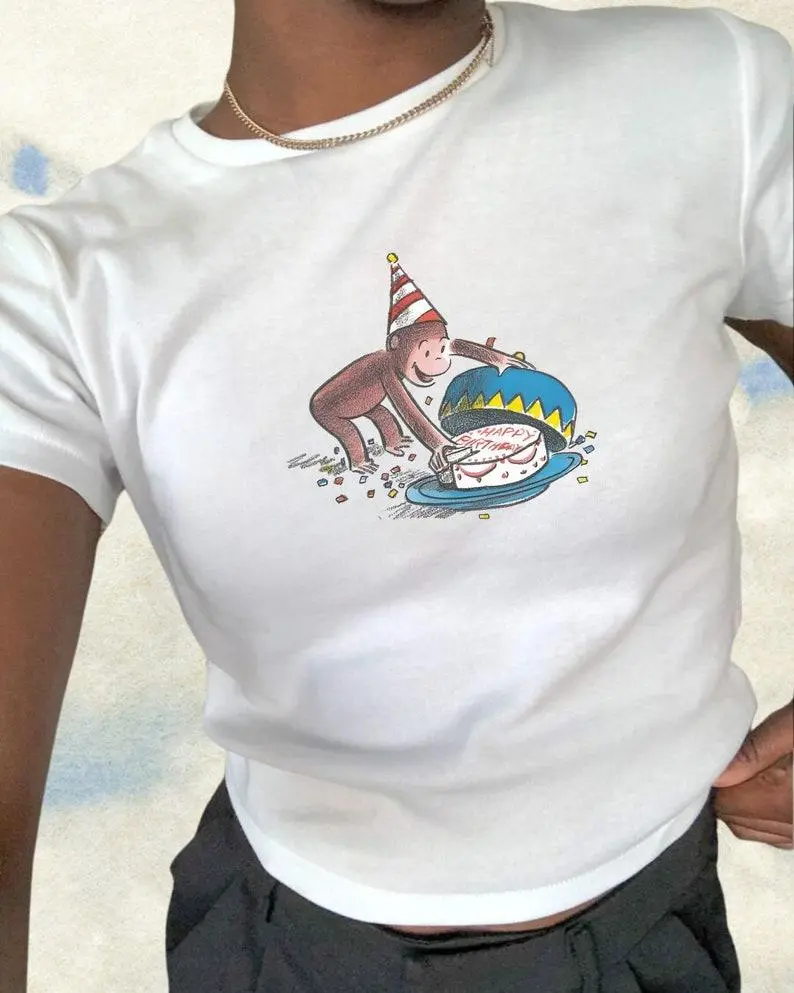 Birthday Cake Baby Tee – Retro Birthday Girl Shirt, Y2K Graphic Tee, Cute Cartoon T-shirt for Birthday Celebrations