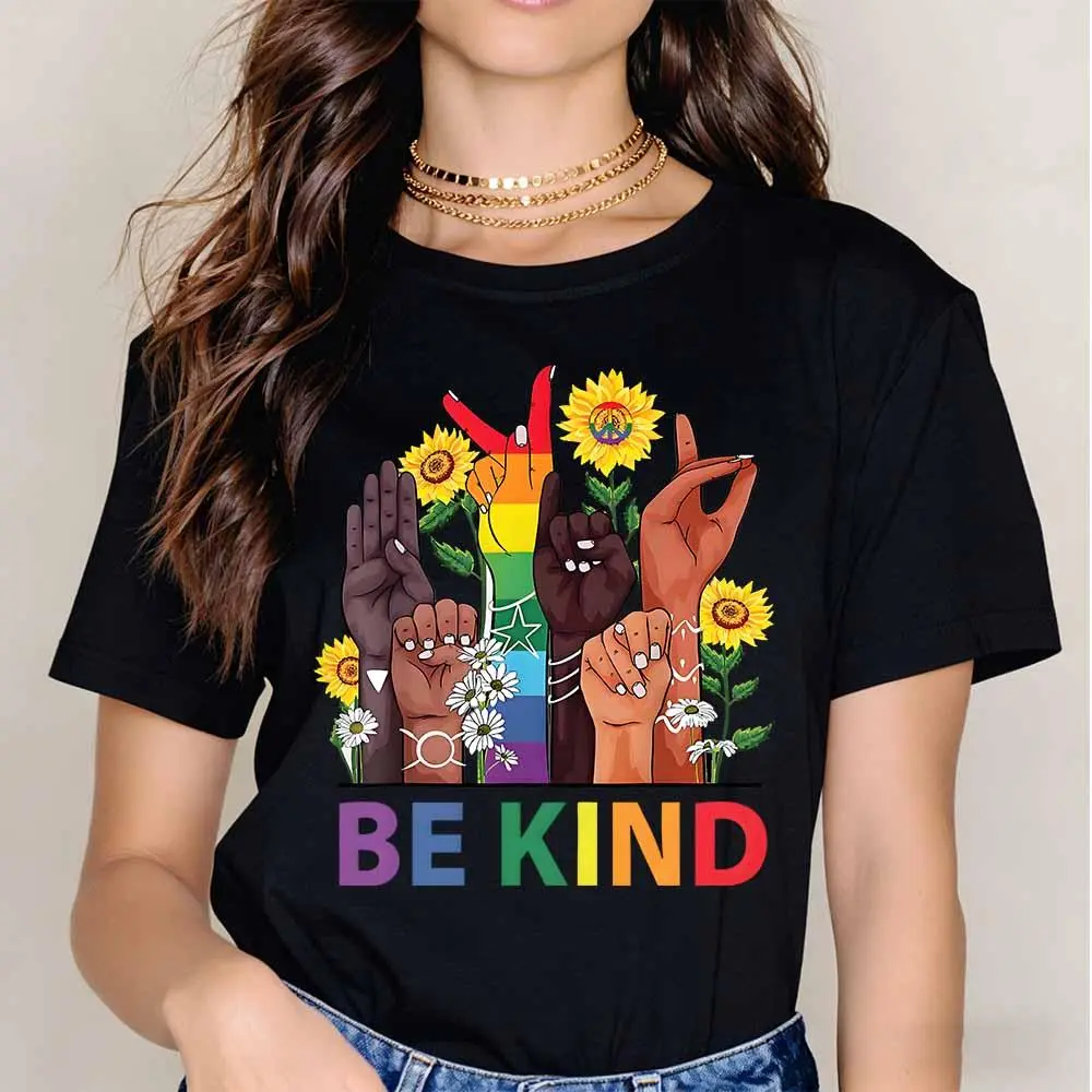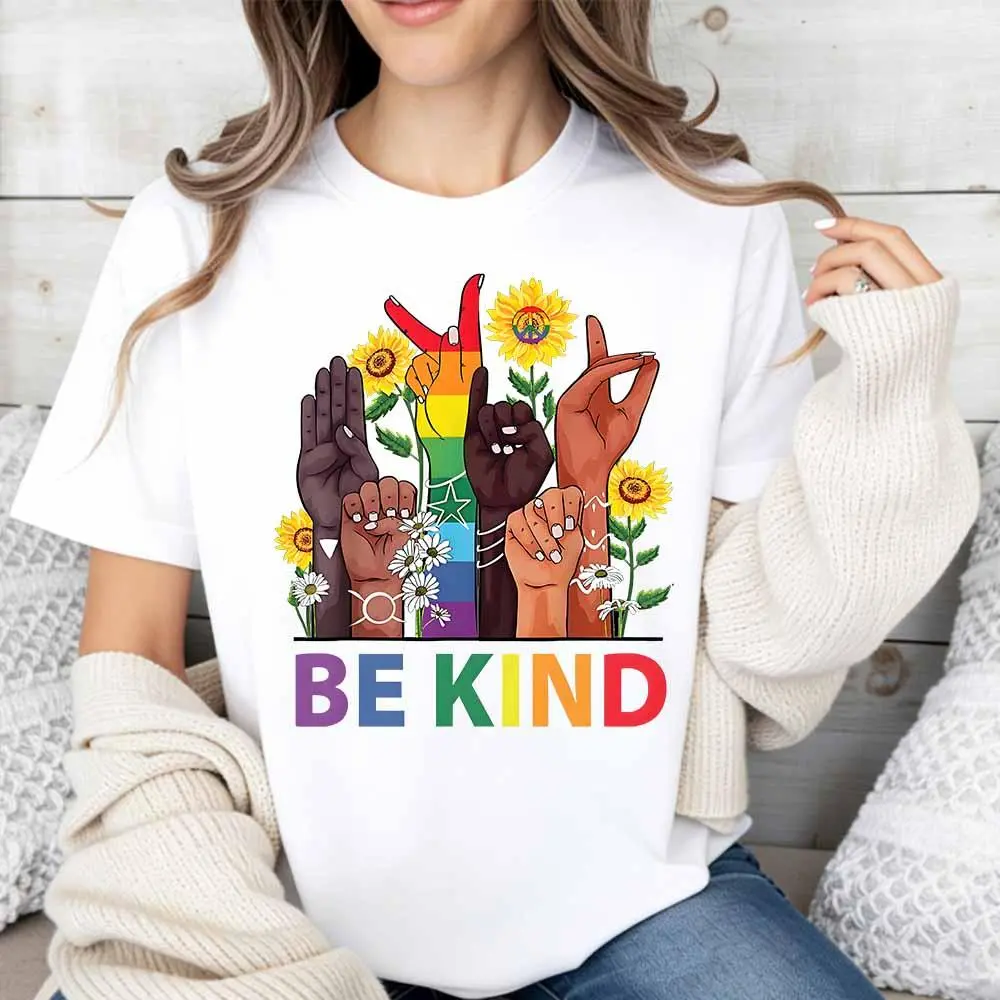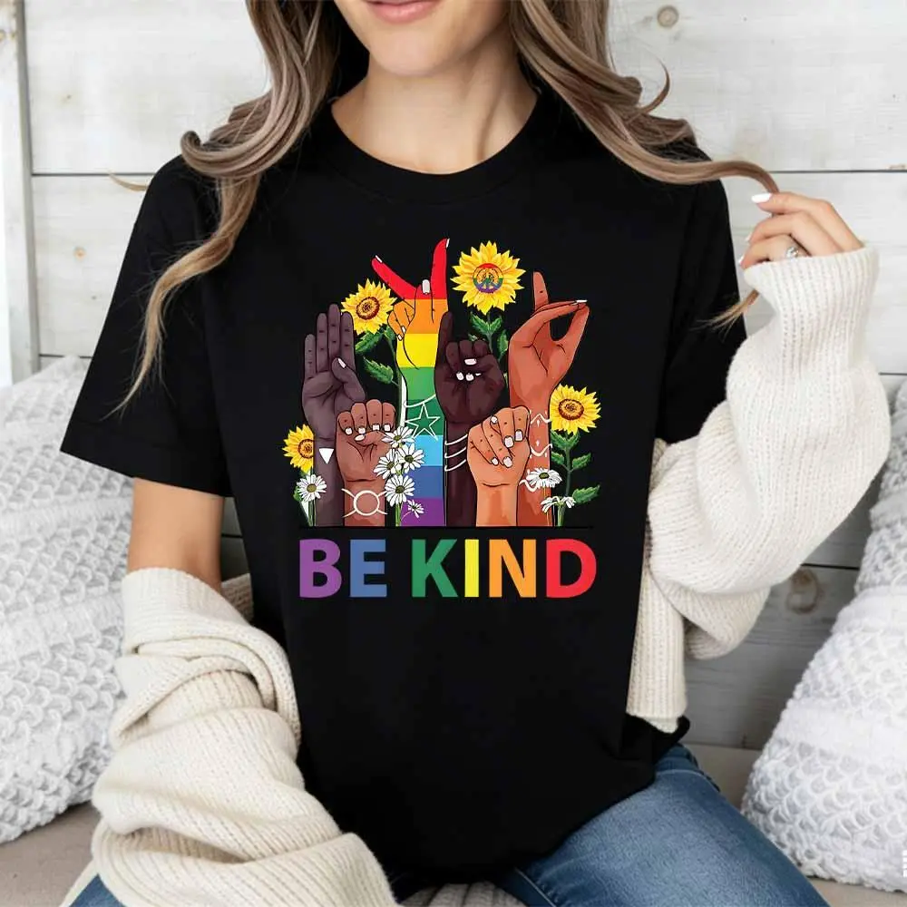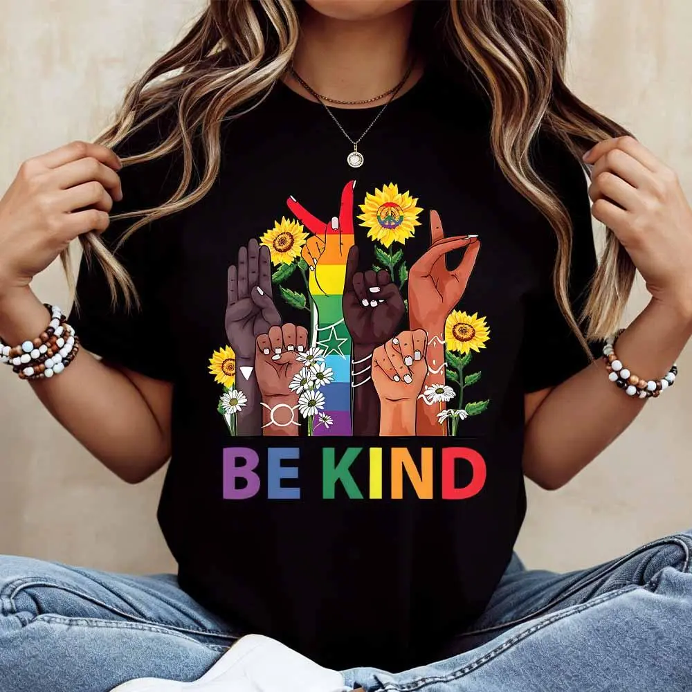 Be Kind Rainbow Hands and Flowers T-Shirt, cotton, casual, crew neck, short sleeves, regular sleeves, summer wear, machine washable, not dry clean, made in USA