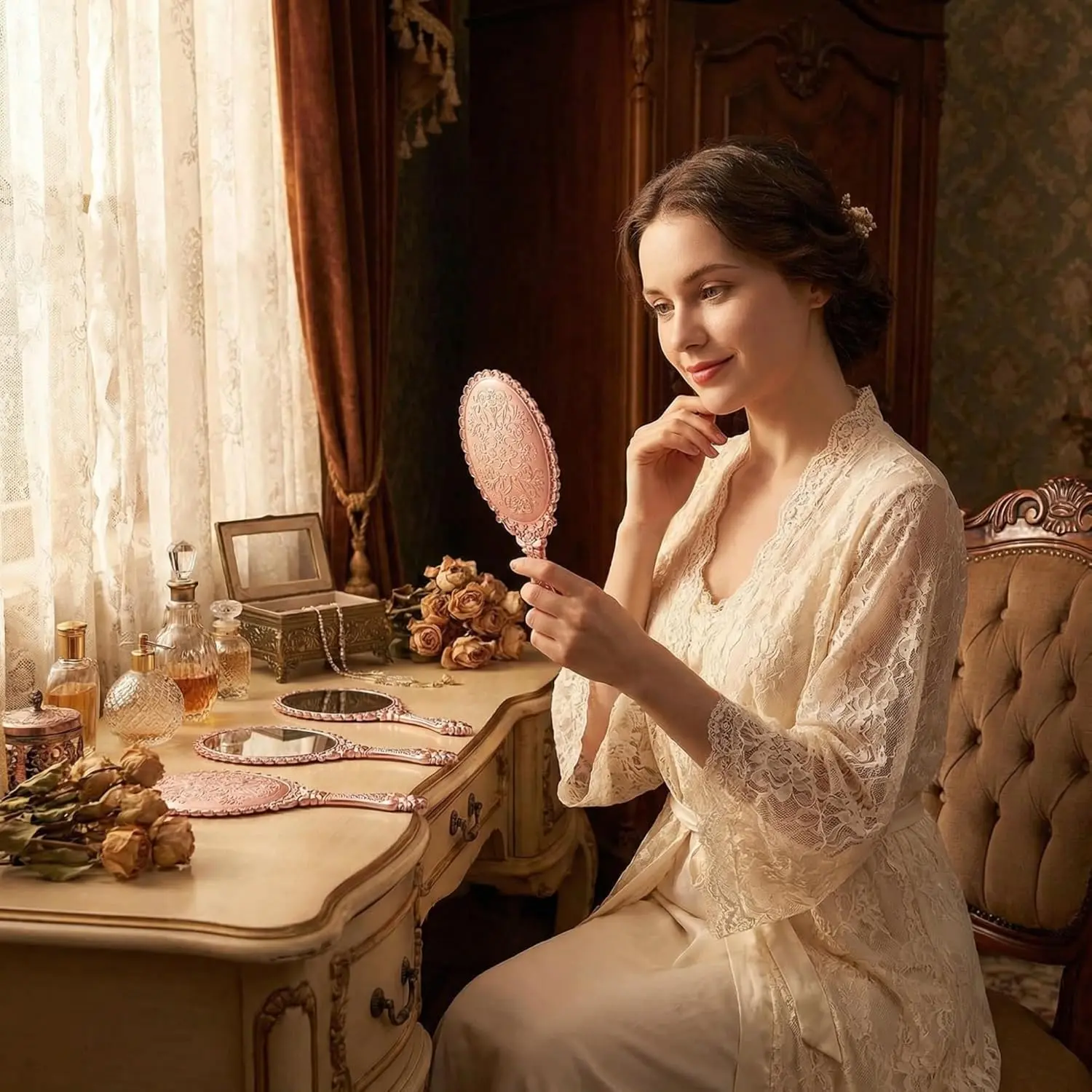 Embossed Flower Design: these hand held decorative mirrors are designed with comfortable handles for long time holding, these classic decorative mirrors are embossed with retro flowers to show elegance, oval shape and retro elements will gain most people favors
