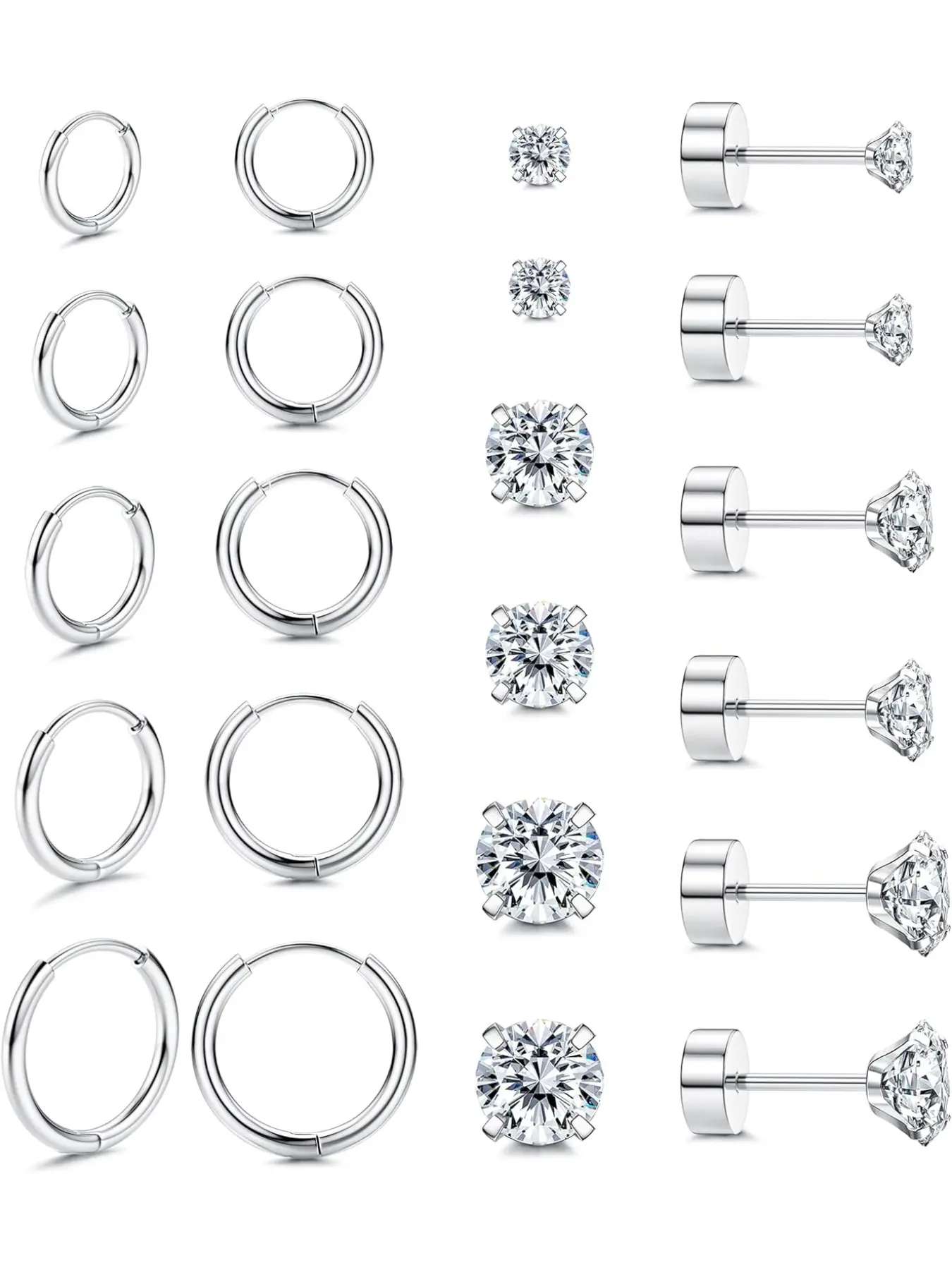 11 Pairs Silver Color Creole Earrings, Small Round Zirconia Ball, 14k Gold Plated, Medical Earrings for Women and Girls, All Seasons