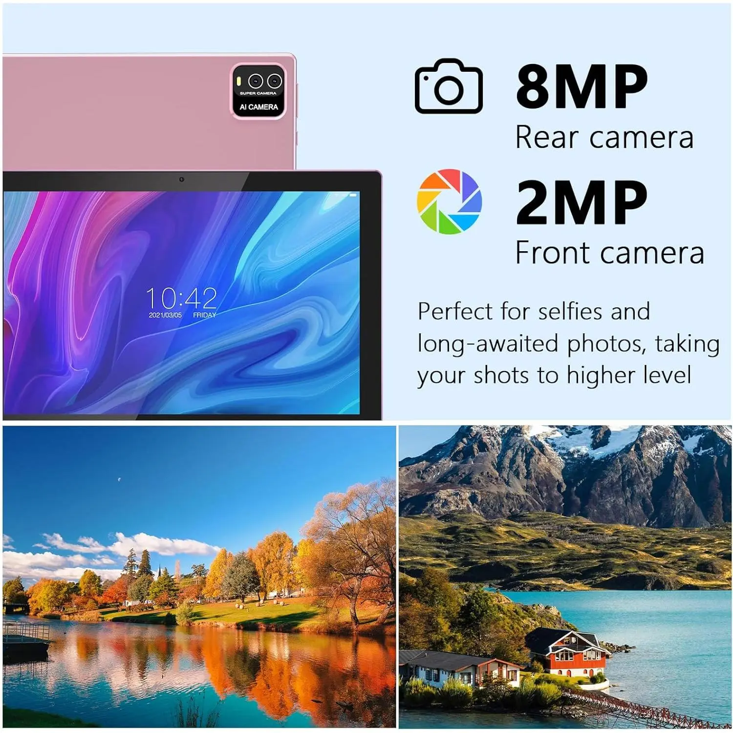[2+8MP Dual Camera] Our 10 inch tablet equipped with a 8MP rear camera with auto focus and flash, is equally clear during the day and night.The 2PM front camera bring excellent clarity during video calls.