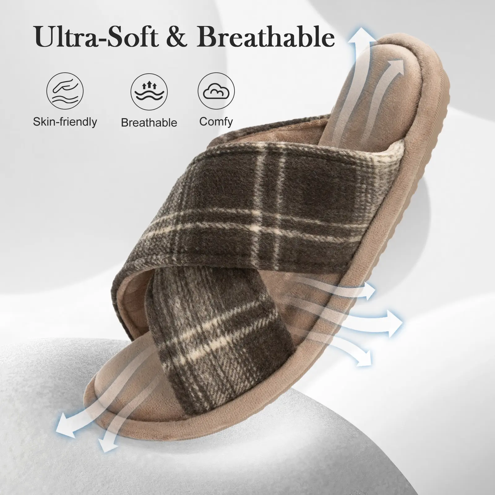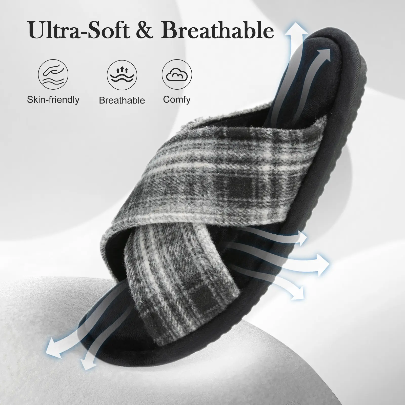·Timeless Checkered Design Slippers:Classic two-tone plaid blocking mens slippers is generous and unique. The cross-strap construction not only enhances the aesthetic appeal but also provides a secure, wraparound feel to the fit.