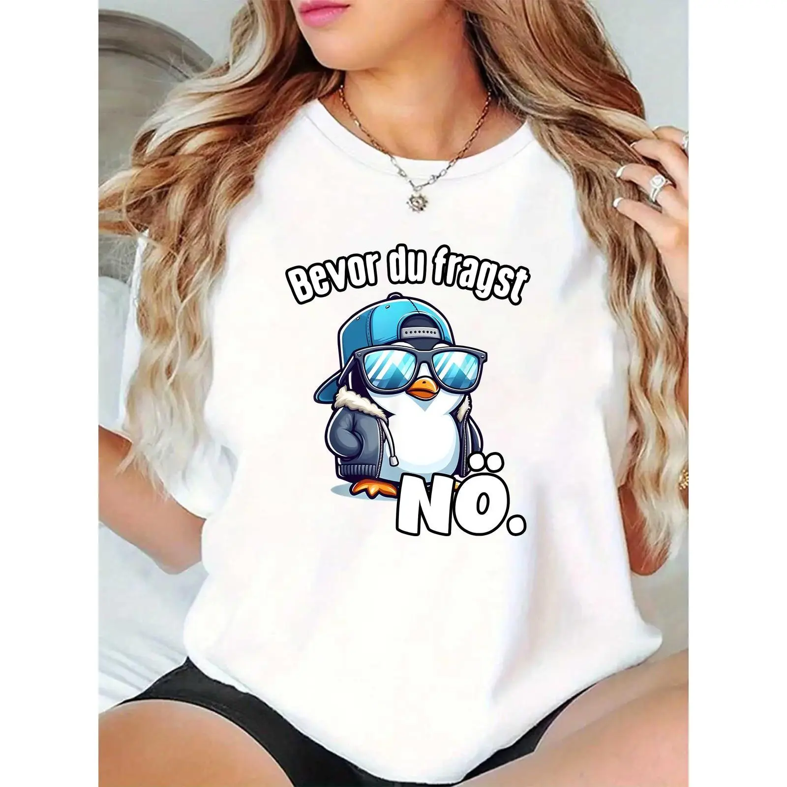 Women's Cool Penguin Graphic T-Shirt | Stylish Penguin with Cap & Sunglasses, Funny German "Bevor du fragst NÖ" Quote, Casual Daily Streetwear Top for Ladies 100% Cotton T-shirt