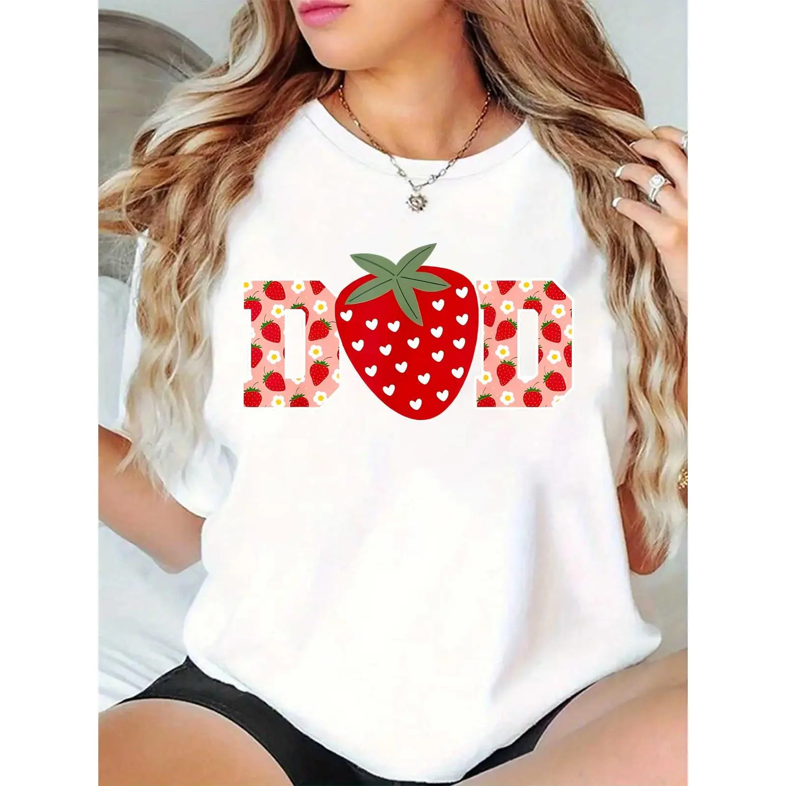 Women's Strawberry Heart DAD Graphic T - Shirt, Casual Summer Short Sleeve Crewneck Tee, Cute Floral Strawberry Print Top for Ladies, Ideal for Daily Wear & Father's Day 100% Cotton T-shirt