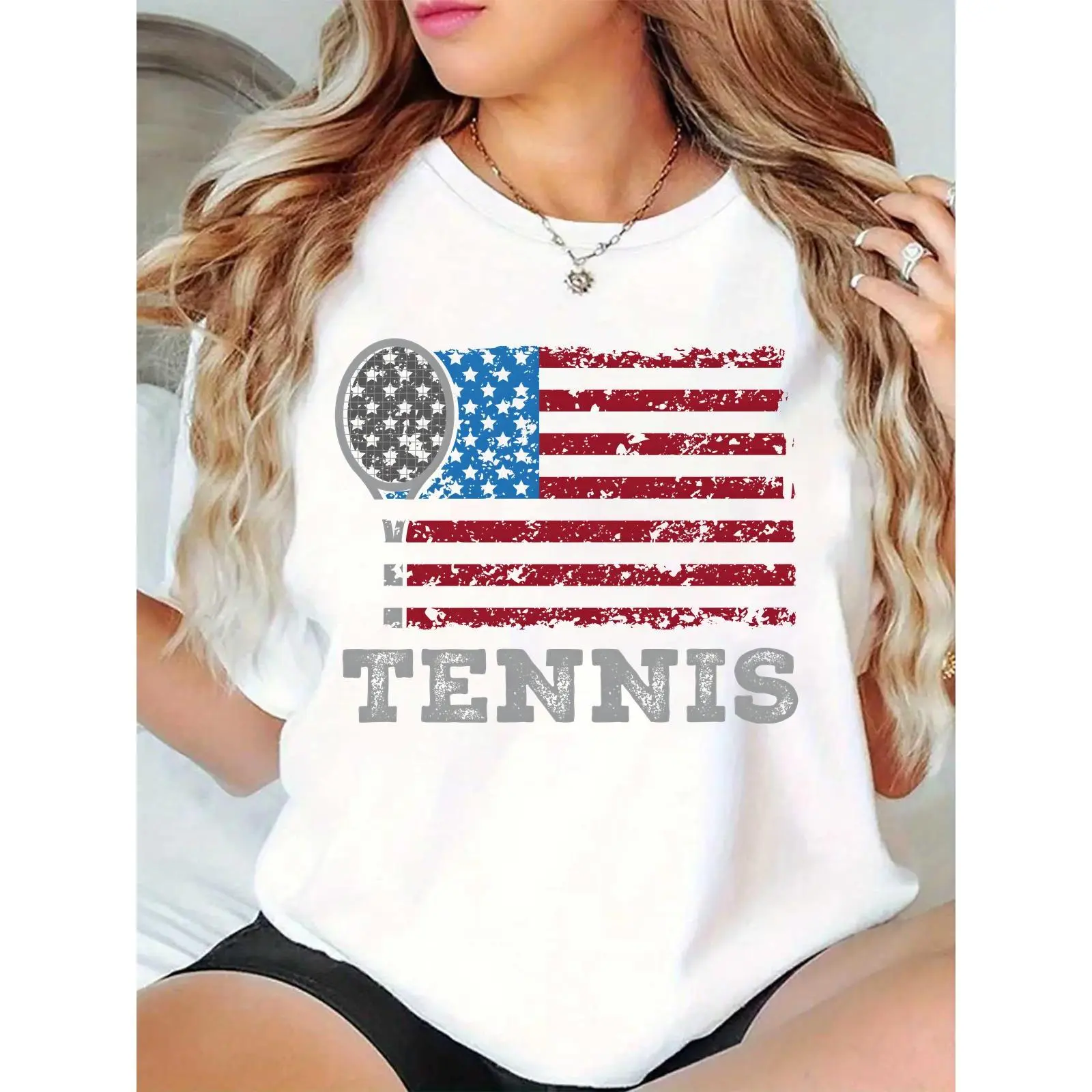 Women's Distressed US Flag Tennis T-Shirt, American Flag with Tennis Racket & Ball Graphic, Casual Sports Tee for Tennis Lovers, Ideal for 4th of July, Daily Wear, Tennis Training 100% Cotton T-shirt