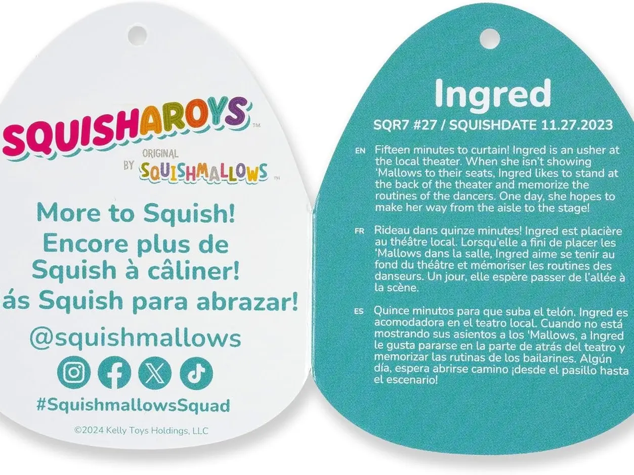 ·Each Squishmallows comes with a unique name and bio. Ingred is a theater usher!