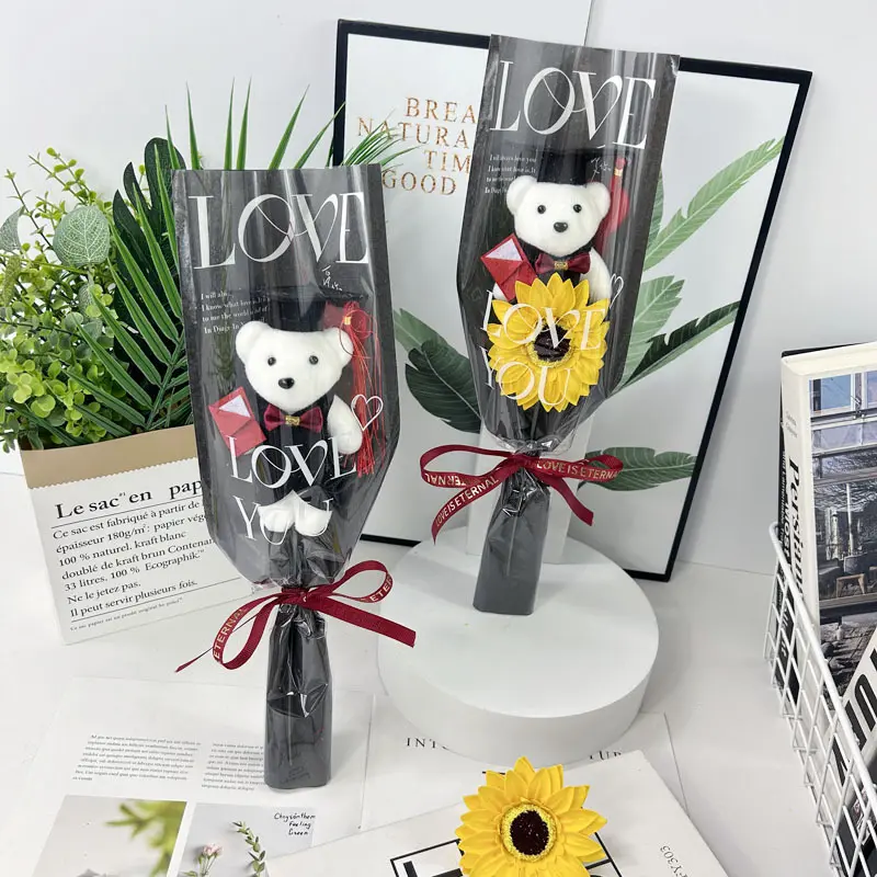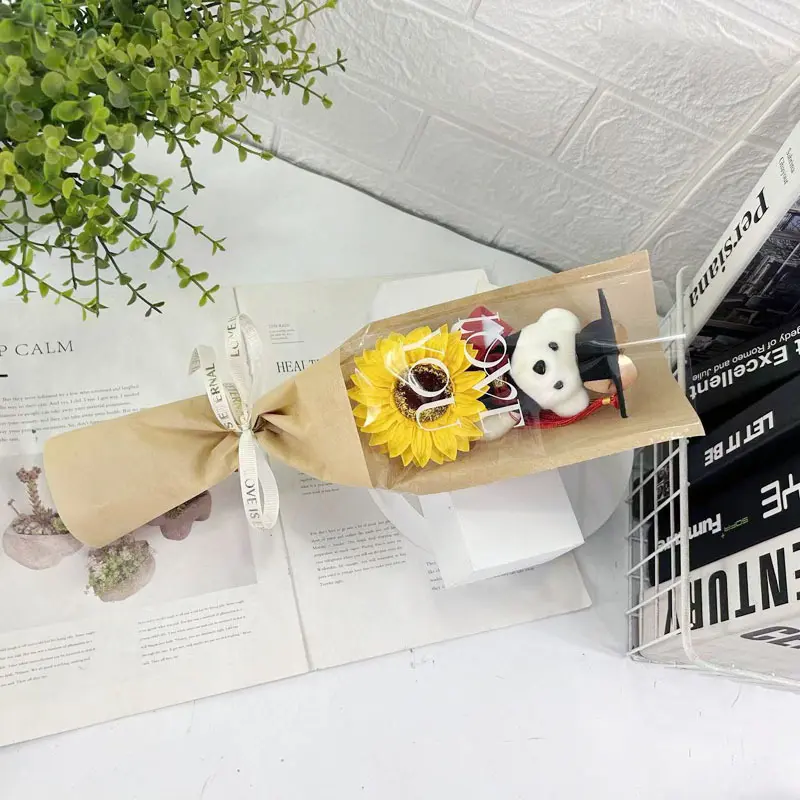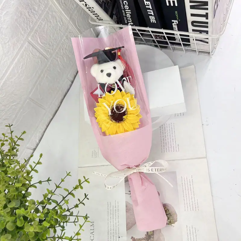 3pc Golden Heart Wrapped Teddy Bear with Graduation Cap Bouquet, Artificial Sunflower Bouquet, a Gift for Friends, Classmates, or Girlfriends during Graduation Season