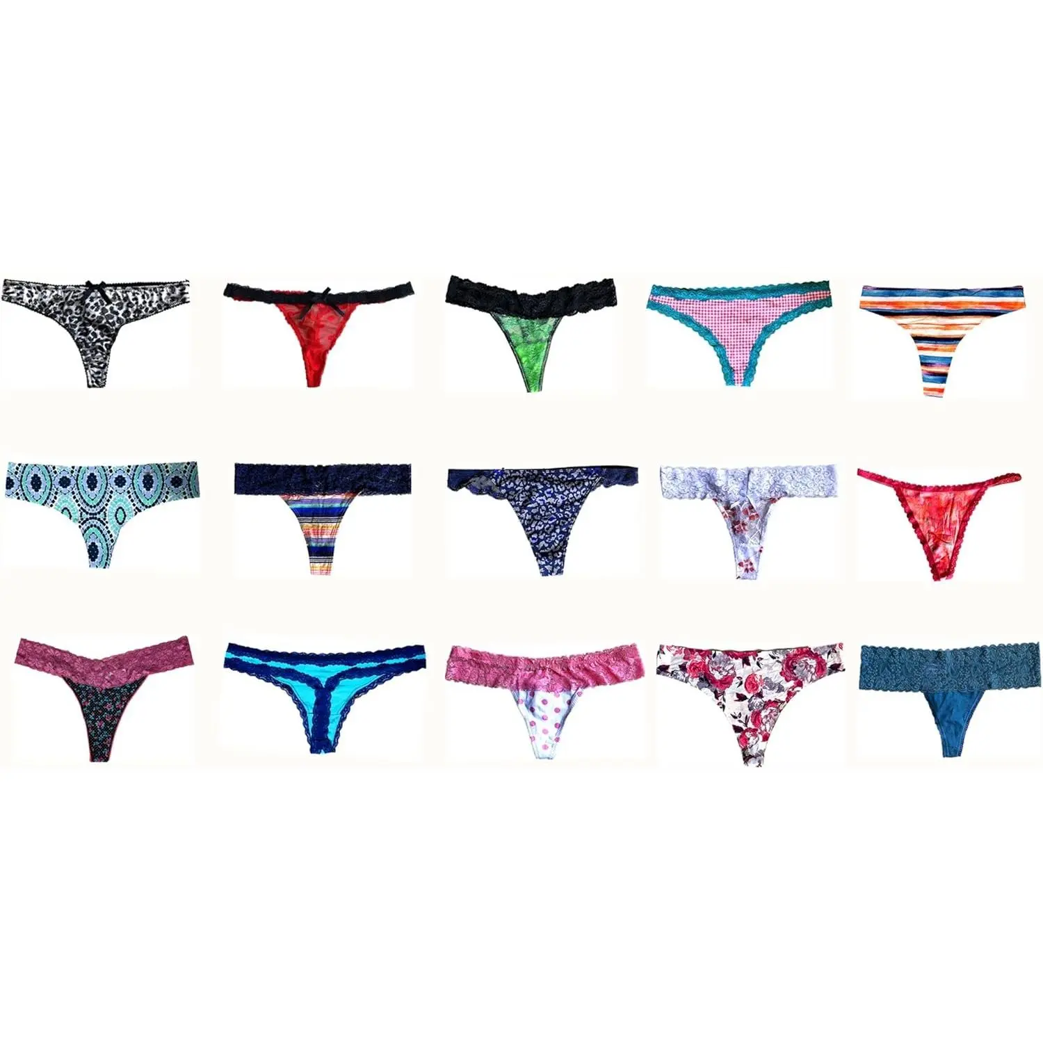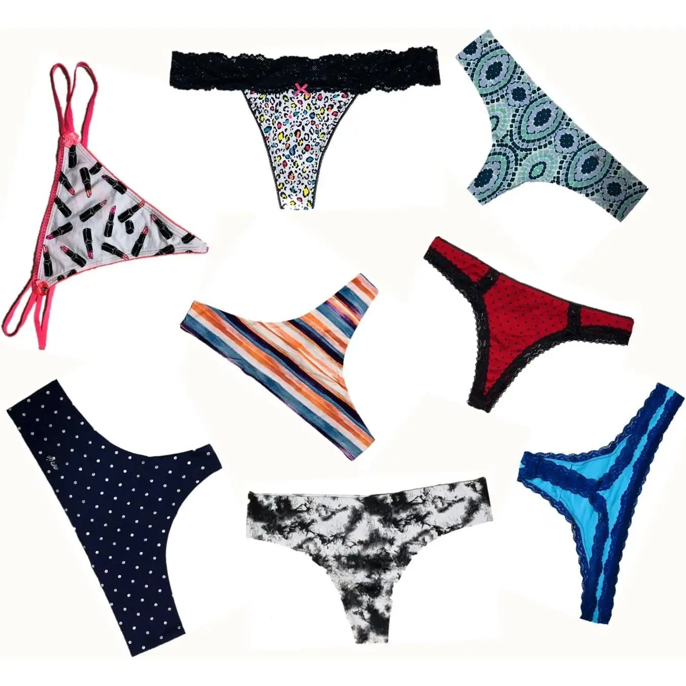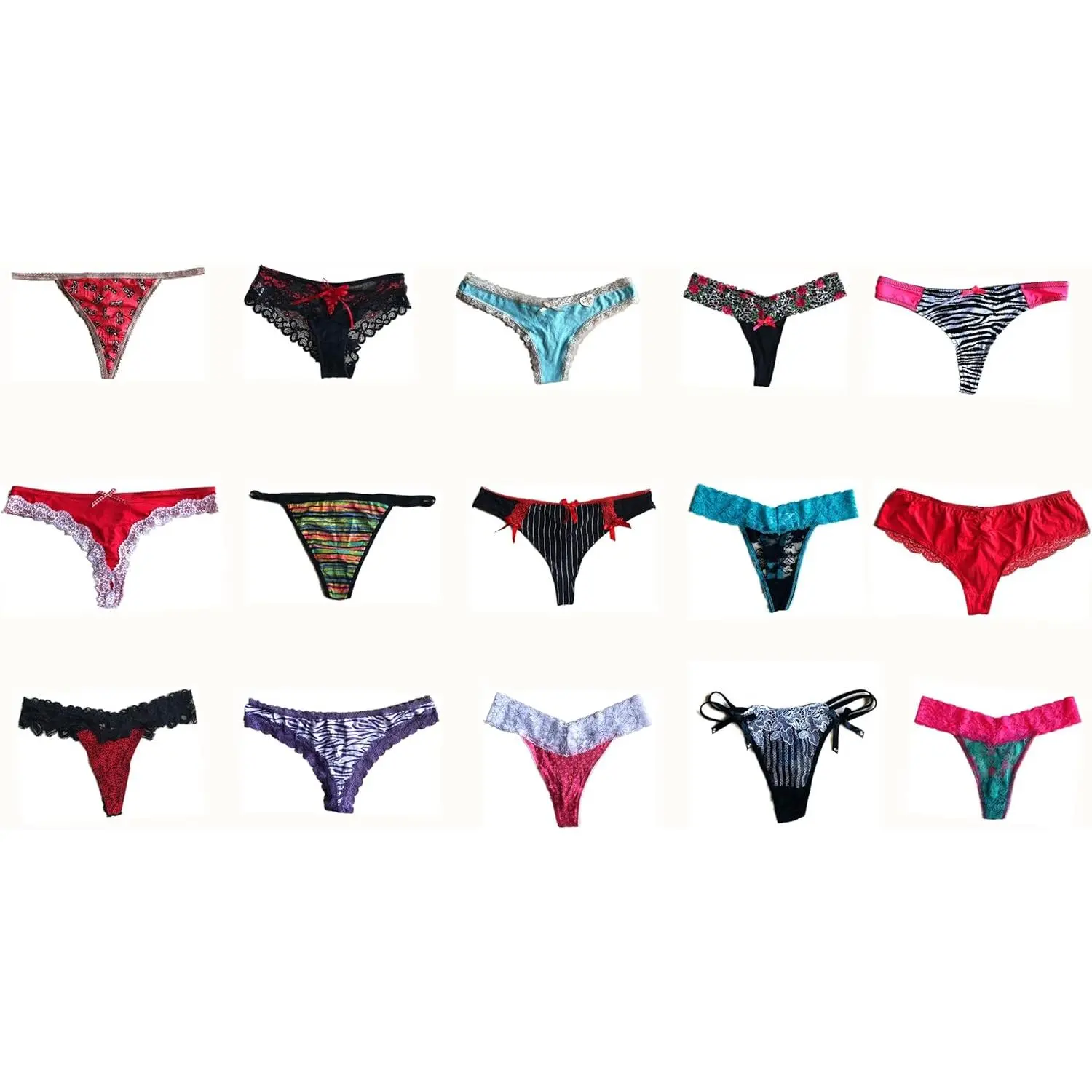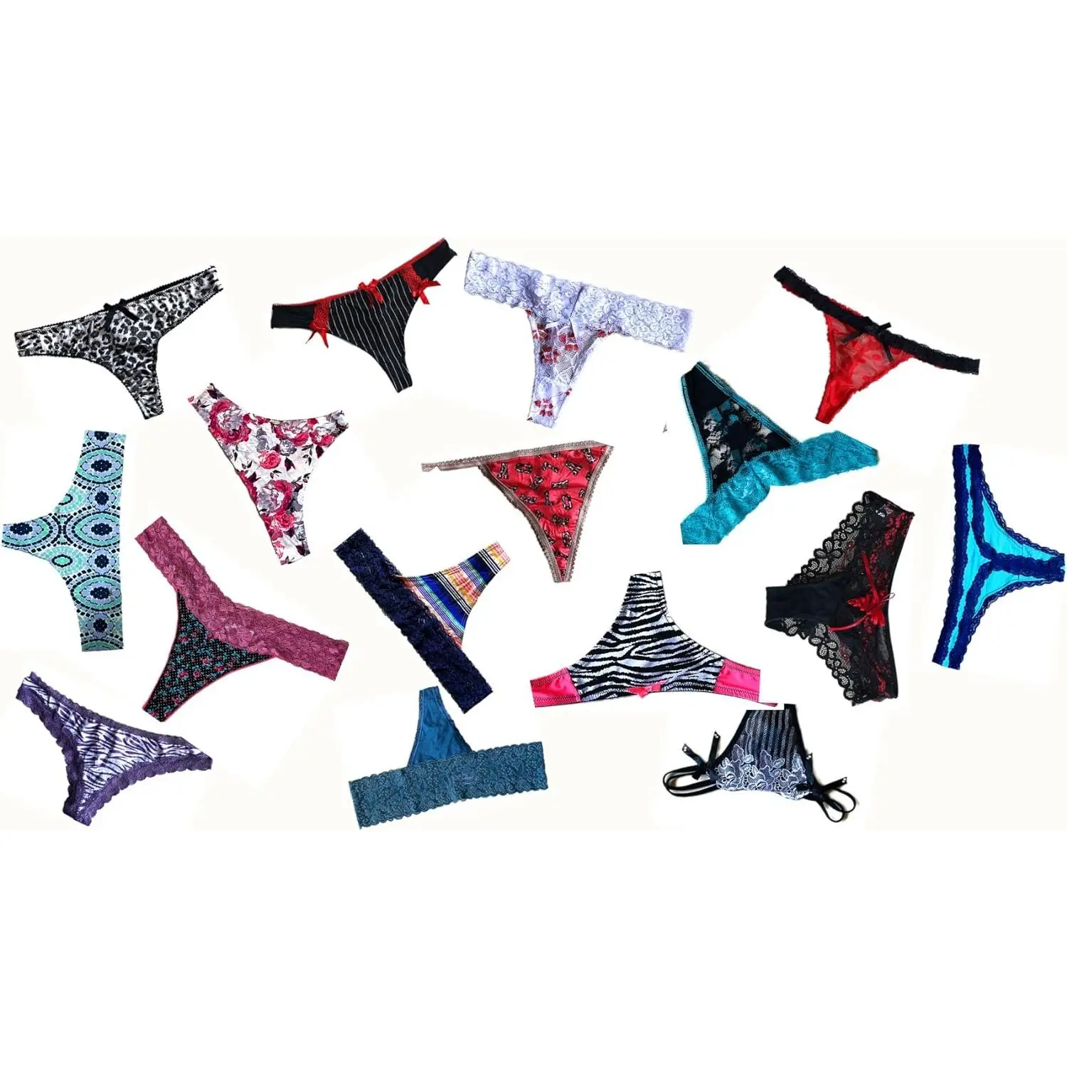 Variety Set 1 will assort most lacy fabric thongs, g-strings, strings and less brazilians & bikinis which have least coverage on the back to suit your sexy and cute needs;