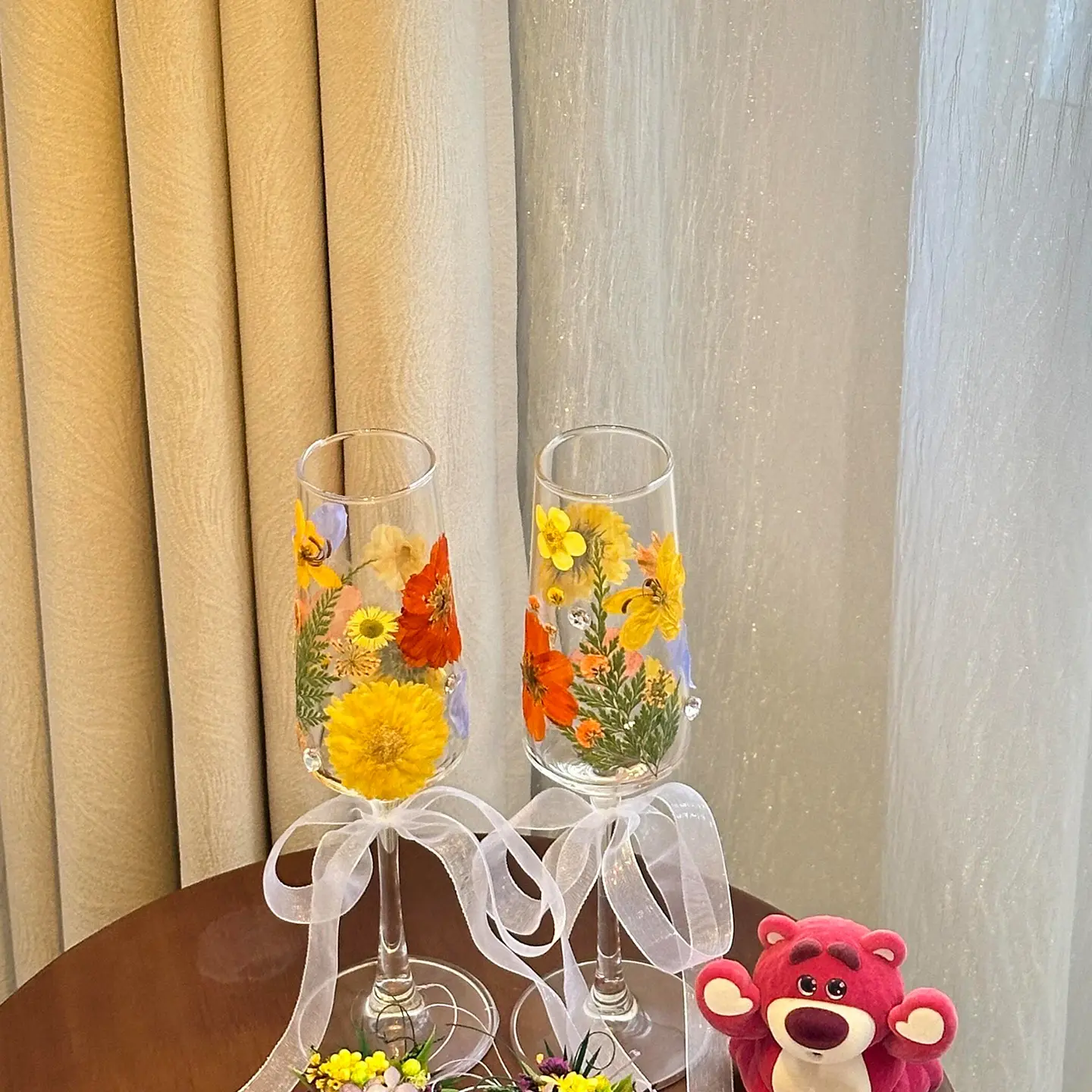 Each glass is a work of art, featuring delicate, vibrant dried flowers that never fade, making it the perfect heirloom-quality gift for newlyweds, anniversaries, or any romantic milestone.
