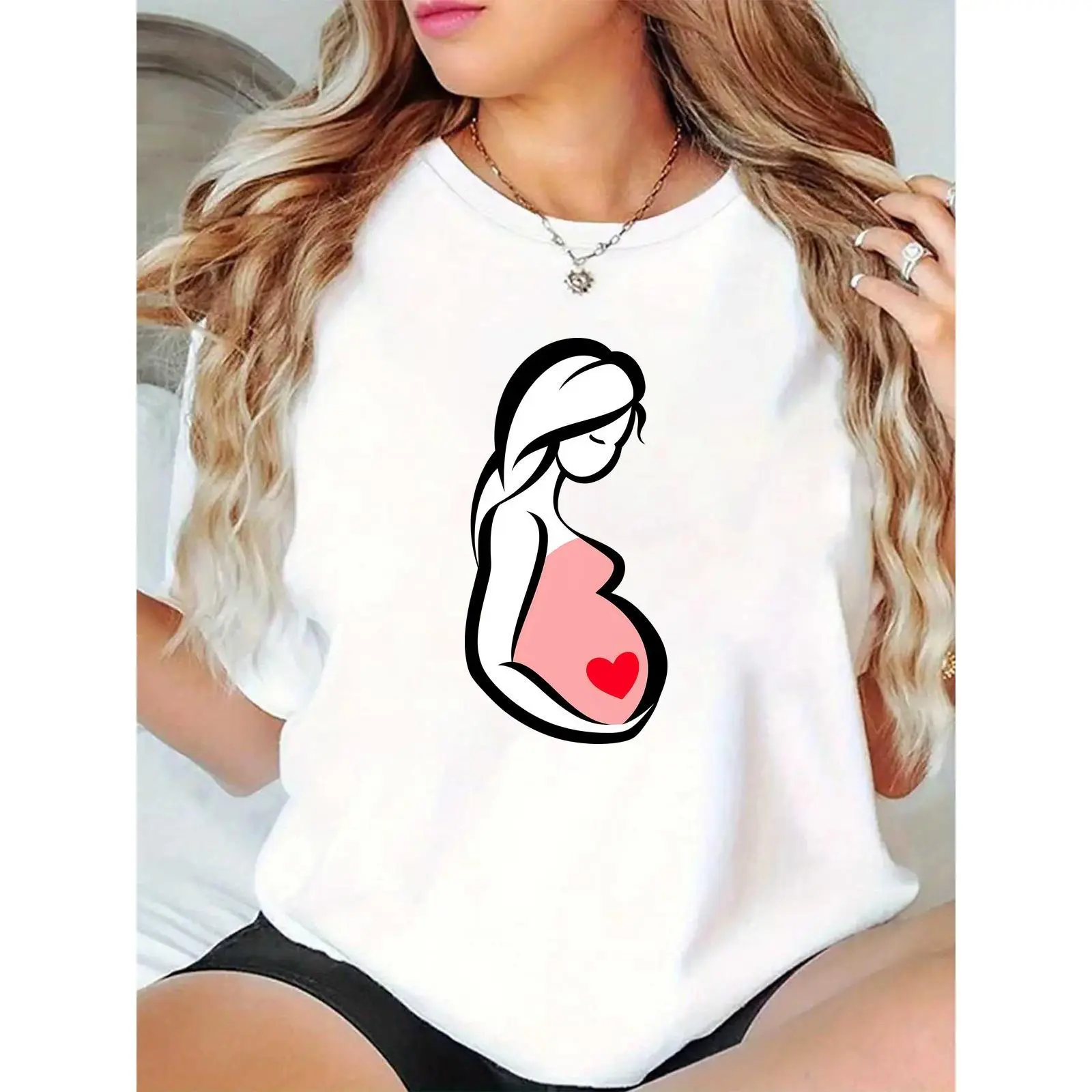 Women’s White Maternity T - Shirt with Pregnant Woman Graphic & Red Heart – Cute Pregnancy Top for Announcement, Mother’s Day, Casual Daily Wear, Ideal for Expectant Mothers 100% Cotton T-shirt