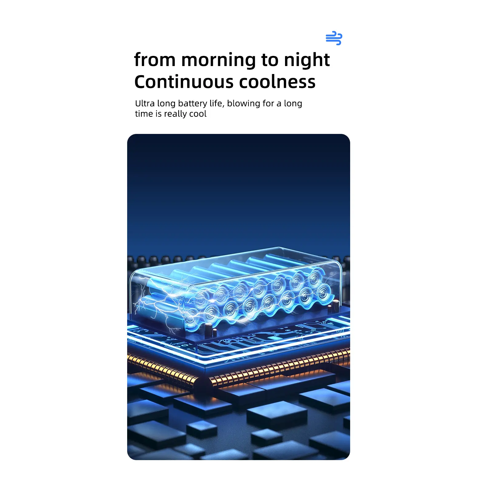 Powered by a high-quality battery, this fan provides all-day long-lasting cooling to keep you comfortable from morning till night. Recharge via the convenient USB-C port for quick and efficient power top-ups. Whether you’re commuting, working at your desk, camping, or enjoying a day at the beach, this fan ensures reliable cooling without interruption.