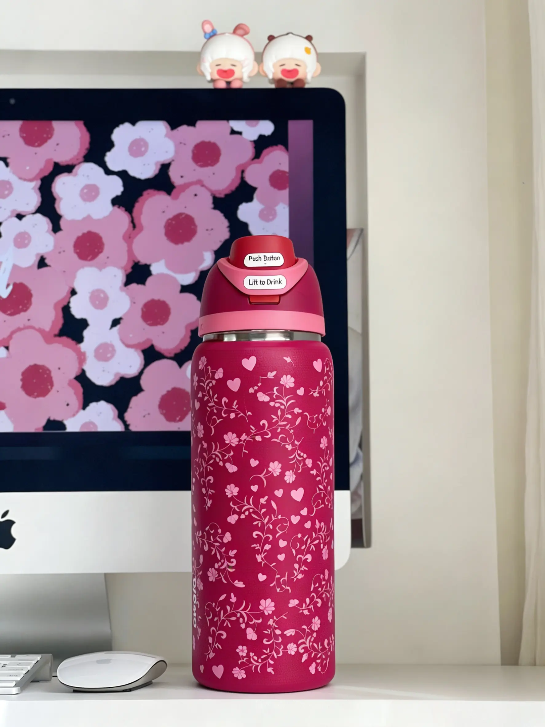 Equipped with a straw and a "Push Button" for easy access. Simply lift to unlock. The bottle's design makes it portable and practical for various activities. 🍹