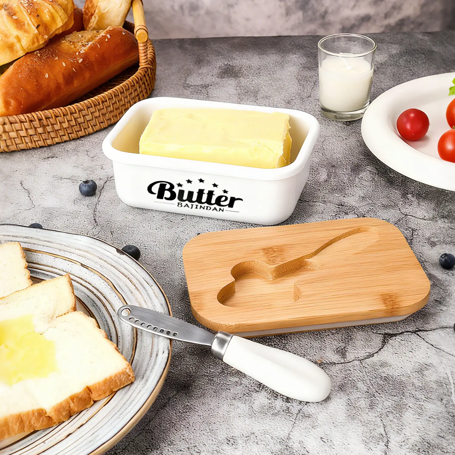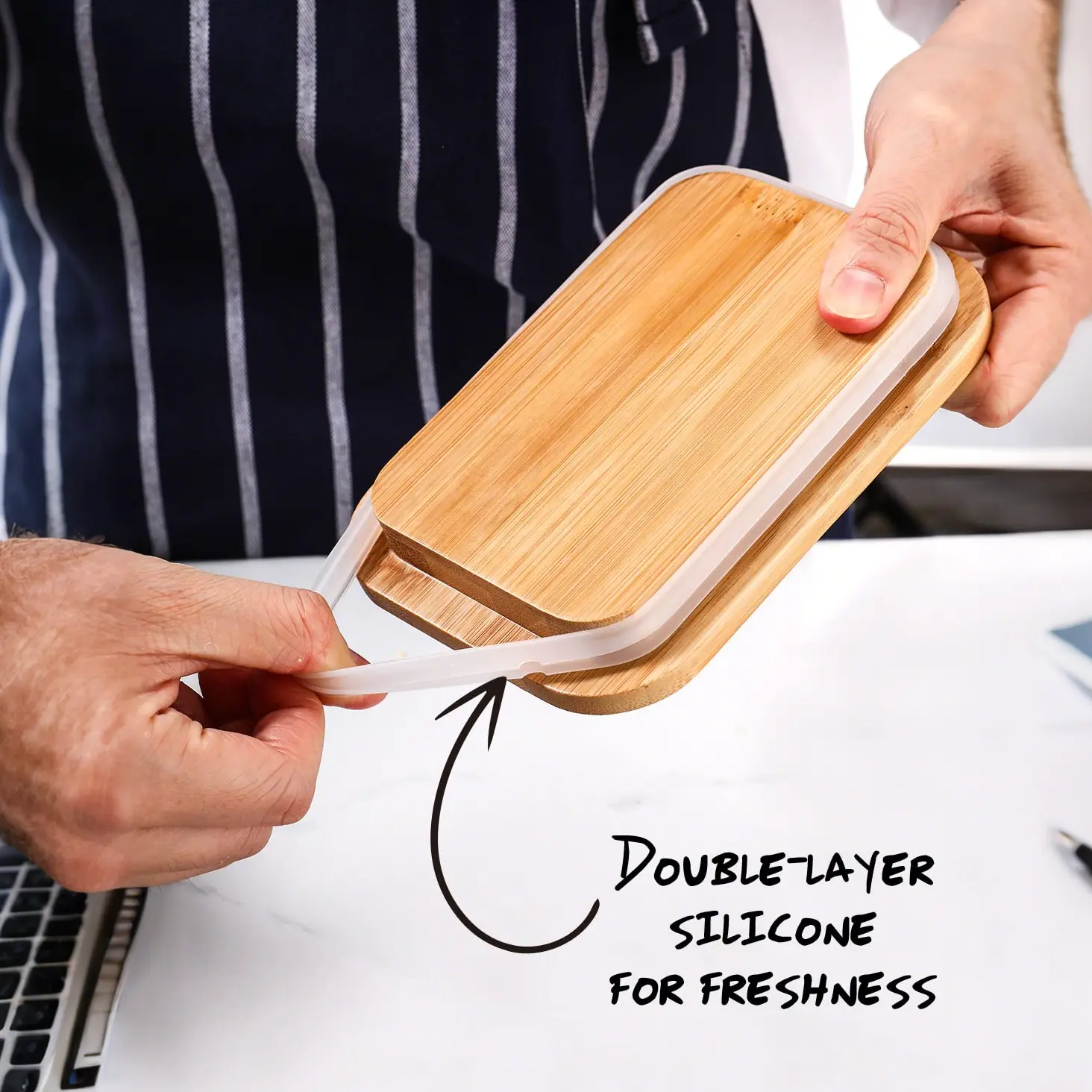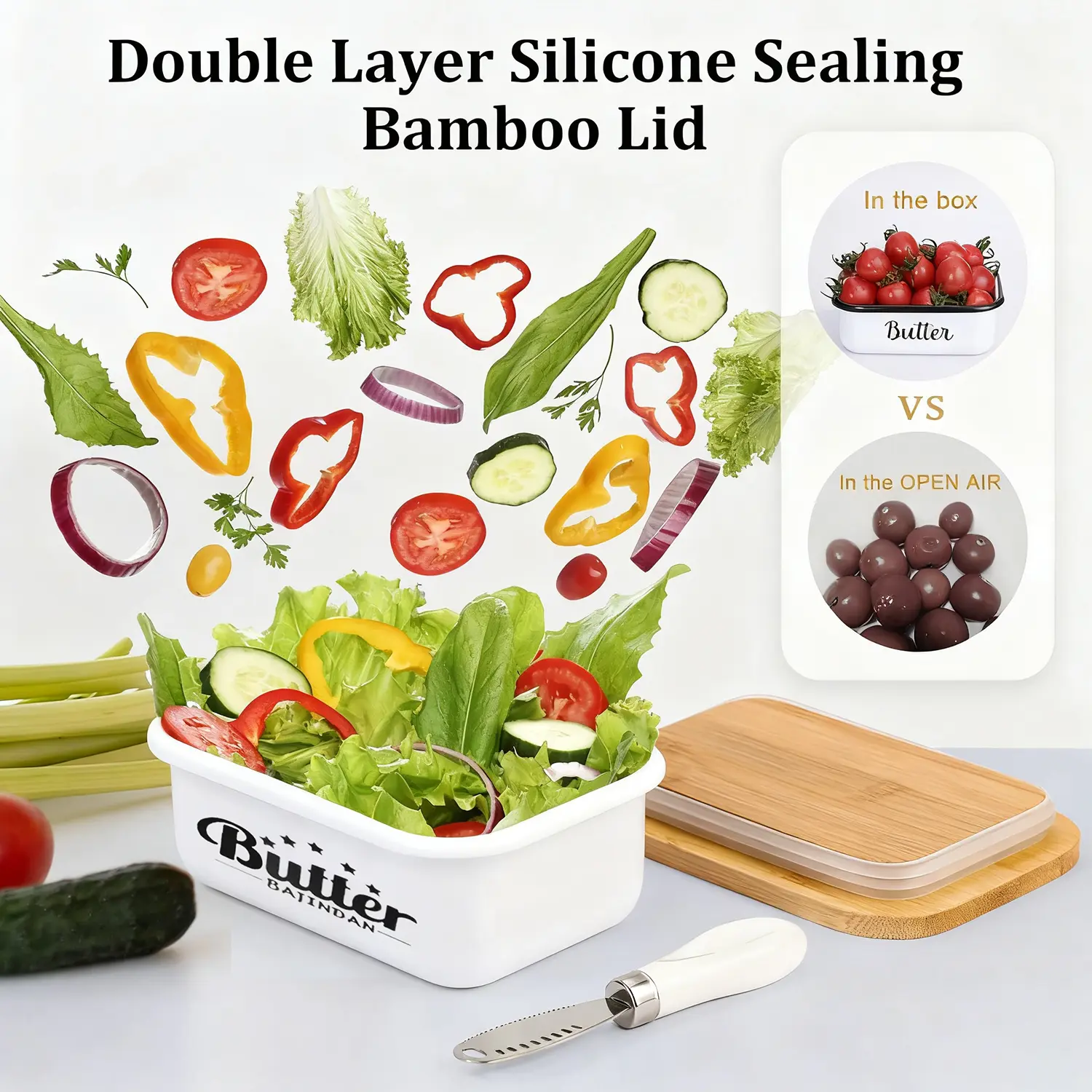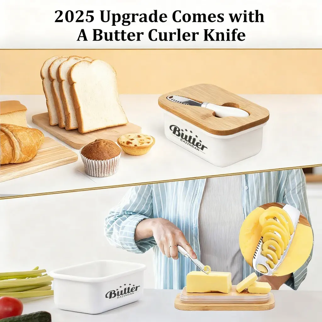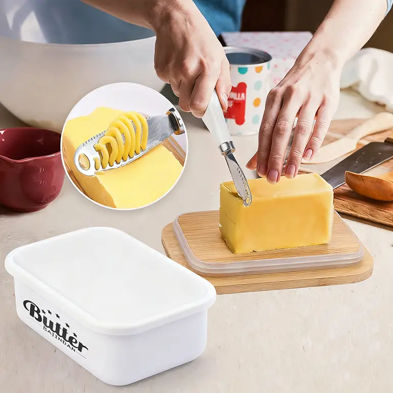 The top cover with an upgraded double silicone seal helps to keep your butter stick fresh in the refrigerator and prevent producing odor. The bamboo cover can be used as a cutting board for butter, and it is very convenient to washed by hand and the butter container supports dishwasher cleaning.