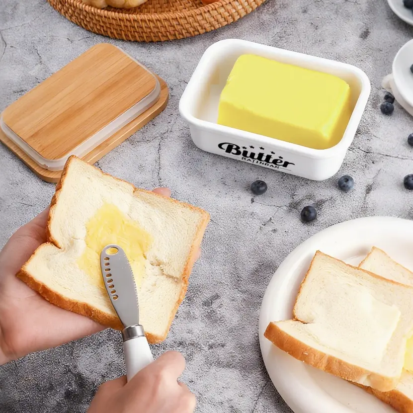 Covered Butter dish with butter curler knife. The butter knife fits perfectly with the cover and this stainless steel butter knife is very cute. The small slot hole on it can curl the hard butter to put on the bread. This butter spread knife is even safely for children to fill their toast with butter or chocolate curls.