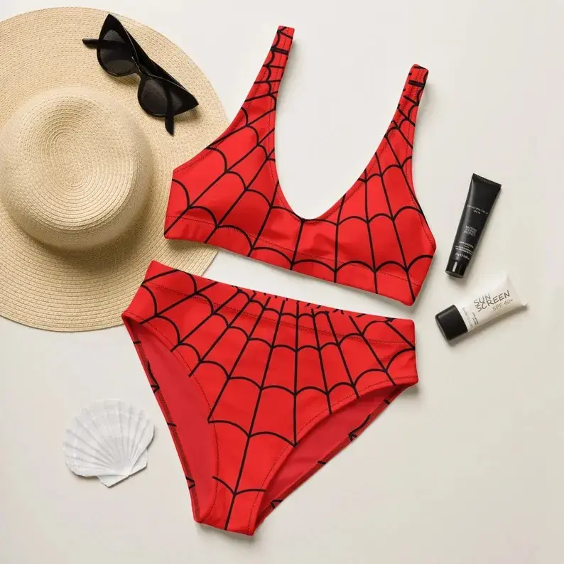 5. Red Spider Web Print Bikini Set Women High Waist Two Piece Swimsuit Superhero Fan Beach Summer Festival Sunbathing Loose Comfortable Swimwear Cool Gift
