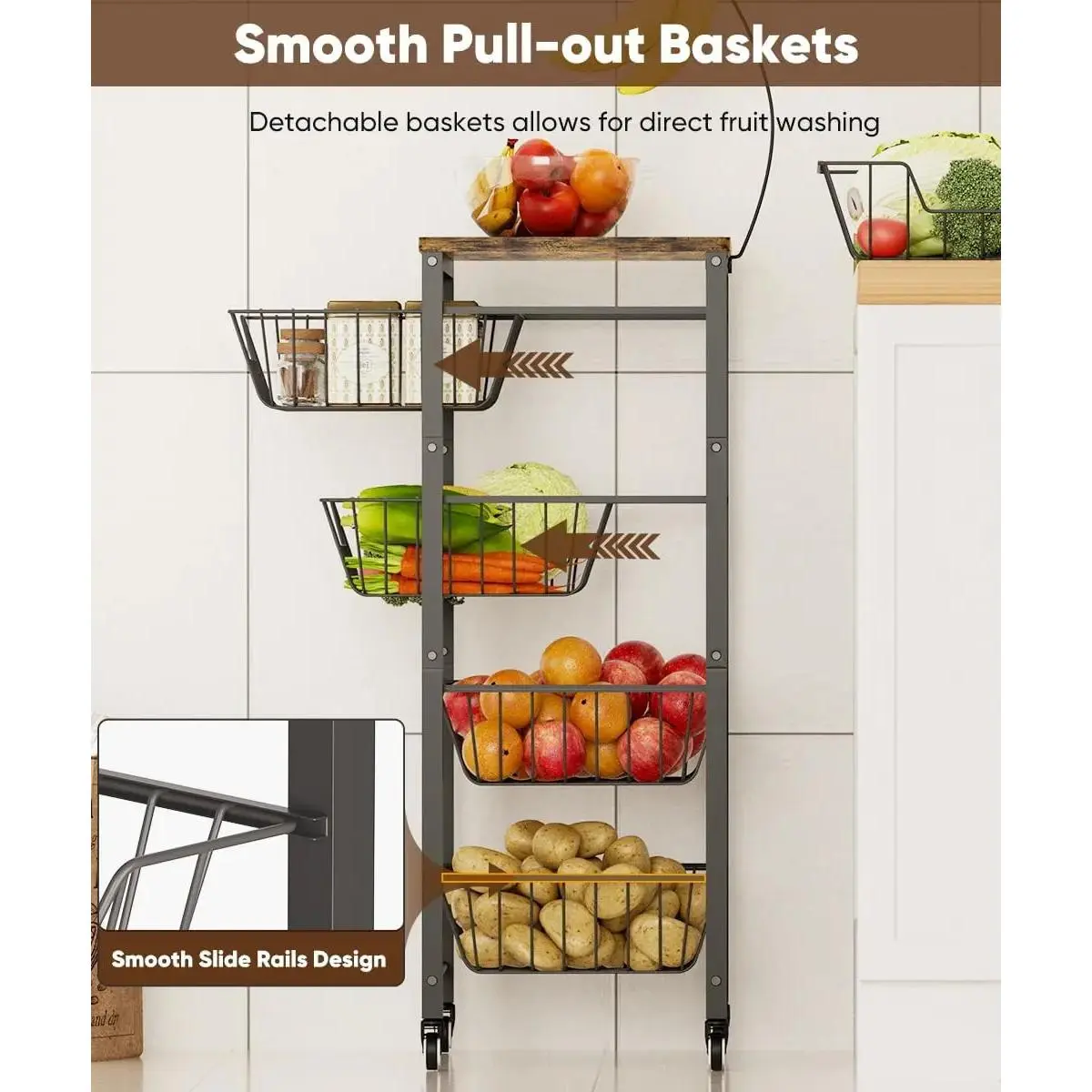 Easy Assembly & Clean: The vegetable storage rack arrives with necessary parts and clear instructions for quick setup. Each storage baskets slide smoothly on built-in tracks for easy access, and the vegetable baskets can be taken out separately for hassle-free cleaning and organizing fruits. Saves time and keeps mess to a minimum with the utility cart for kitchen floor!