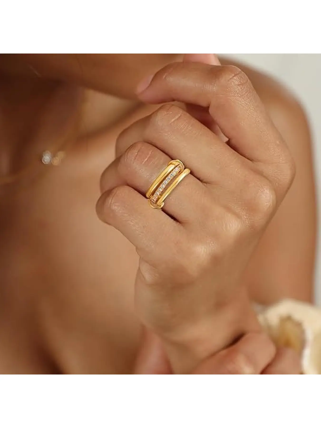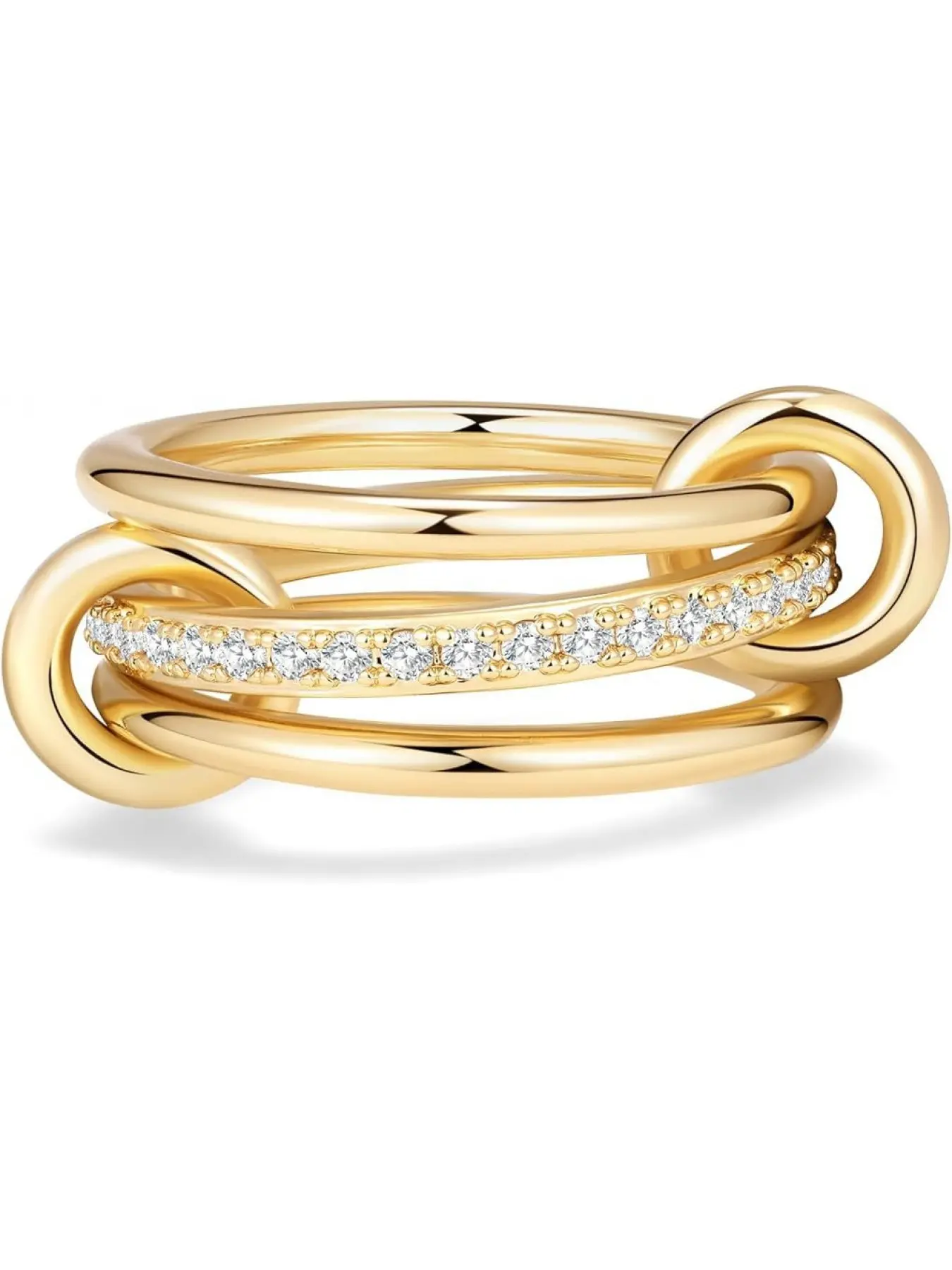 Stainless steel interlocking rings with full diamonds and wave-shaped three-ring design. New color combination and multi-element style.