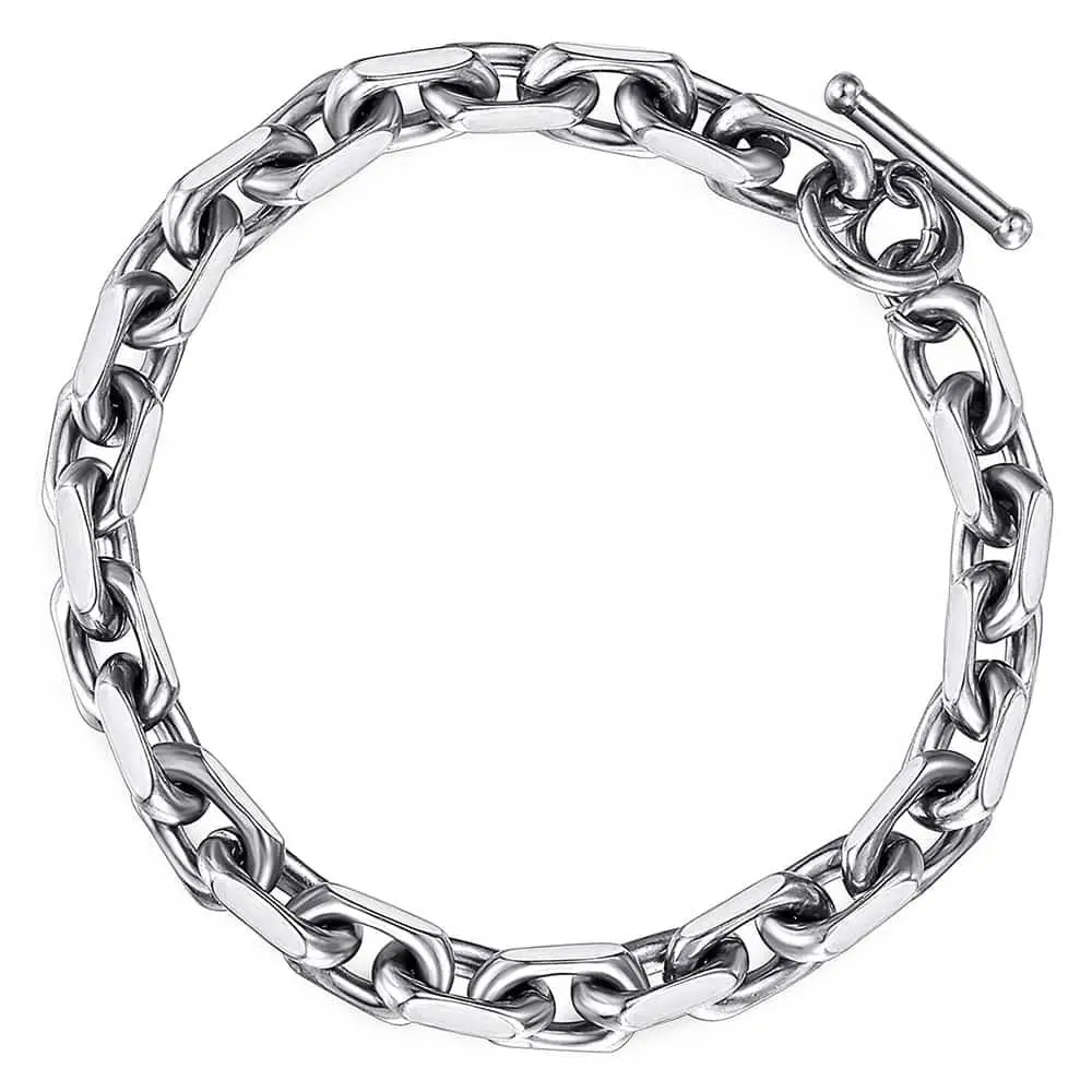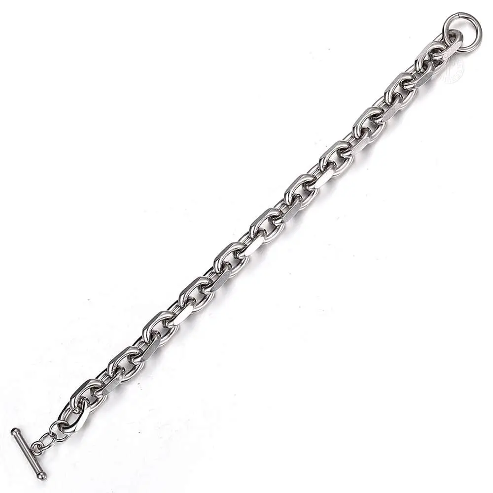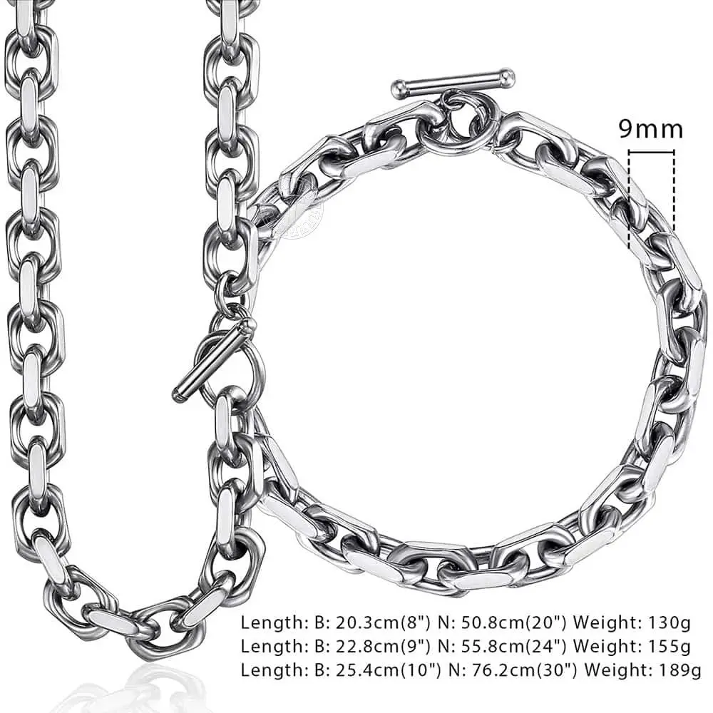 ✨ This set features a 9mm chain cable link design, perfect for men. The stainless steel material ensures durability and a sleek look. The T/O toggle clasp adds a secure and stylish closure. Ideal for everyday wear, this set combines functionality with fashion.