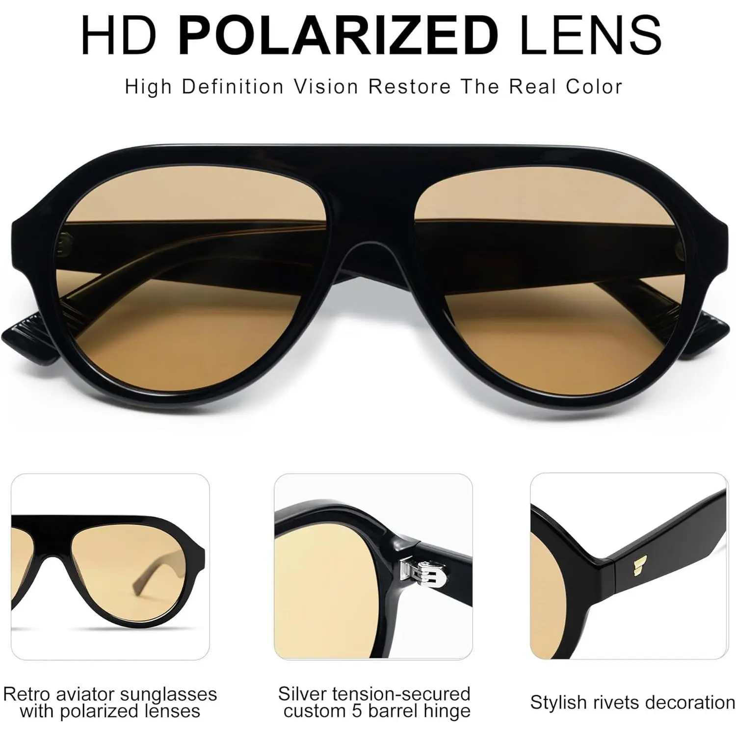 Retro Classic Aviator Style: Fashionable classic aviator frame with bold closed bridge design,stylish rivets decoration ,shiny plastic materials and polarized lenses,it's both chic and protective for your eyes as a fashion accessory