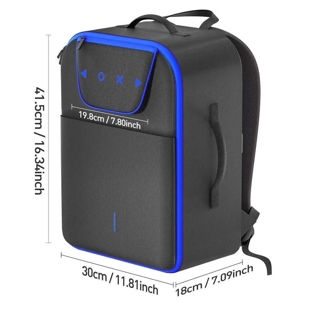 Fits all P5 console versions plus a 16" laptop.Multiple compartments store 2 controllers, game discs, cables, and small essentials.Shoulder strap pouch keeps cards or tissues within reach.