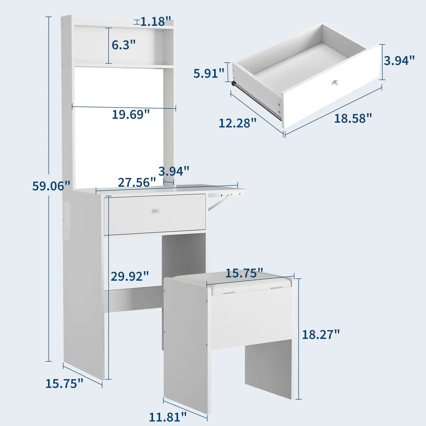 🪑 **Vanity Chair Included** – Ergonomically designed, ideal height for perfect posture. Stool slides completely under the table – zero extra floor space taken.