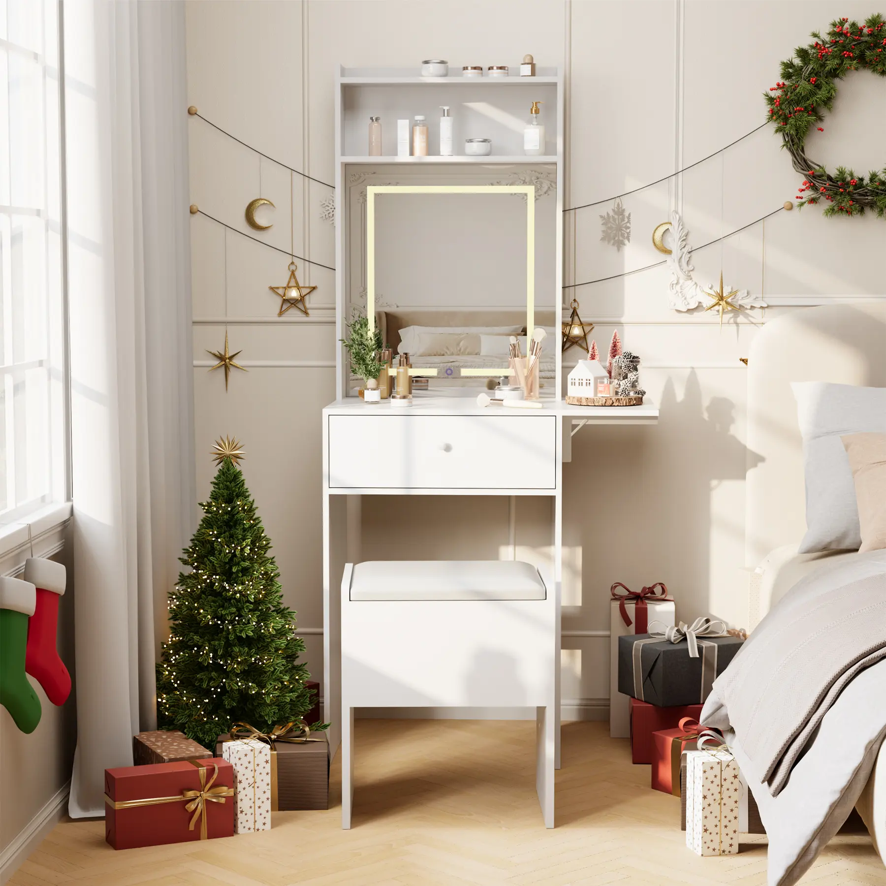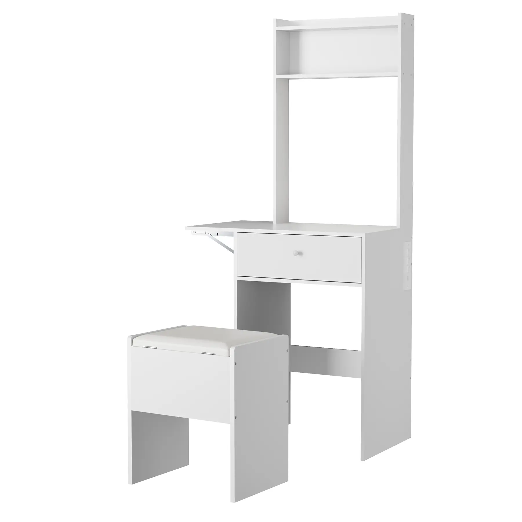 Meet the **White Makeup Vanity Desk with Smart LED Mirror & Power Station** – a **small vanity desk with fold‑up panel**, **storage chair**, and **open shelves**. Perfect for your bedroom! 💕