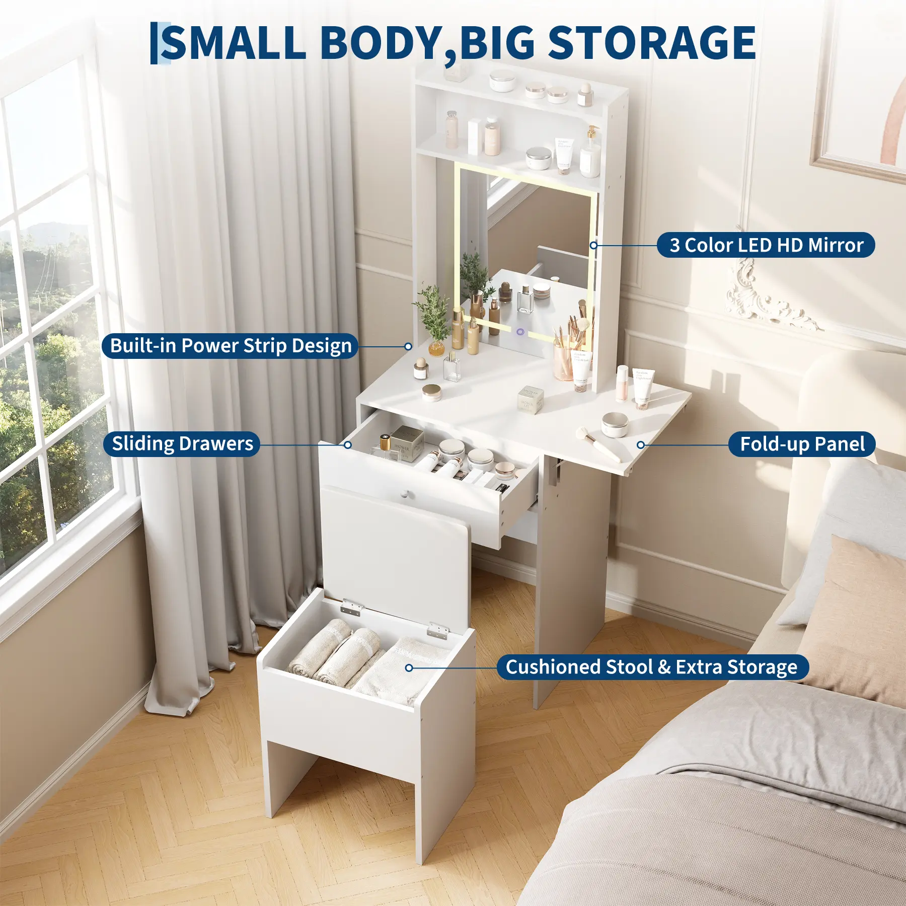💡 **Customizable LED Mirror + Power Station** – Smart LED mirror with 3 color modes + stepless dimming. Flawless makeup at any time of day. Built‑in power outlet – charge your tools right at the vanity.