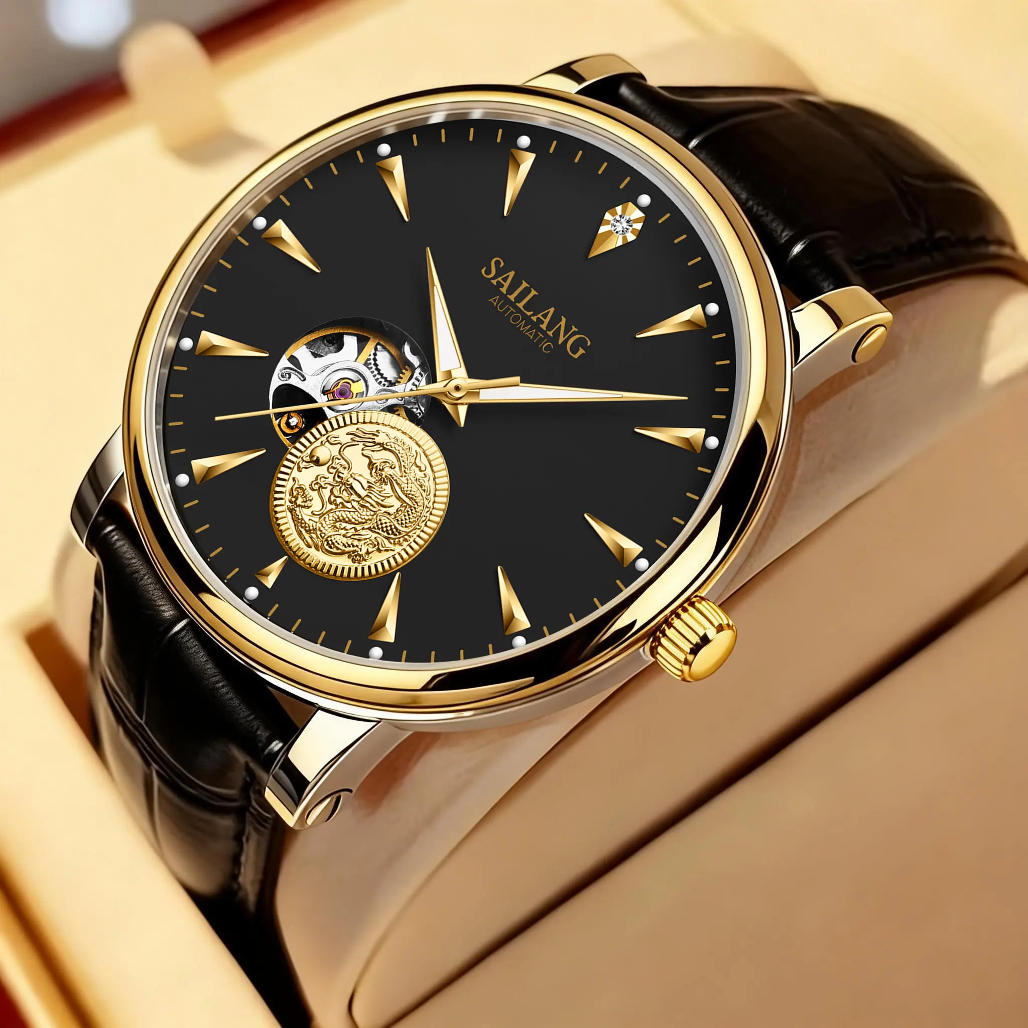 SAILANG Men's Mechanical Watch Round Alloy Skeleton Dial PU Leather Strap Calf Skin Automatic Movement Trendy Stylish Tiktok Viral luxury dress Gift