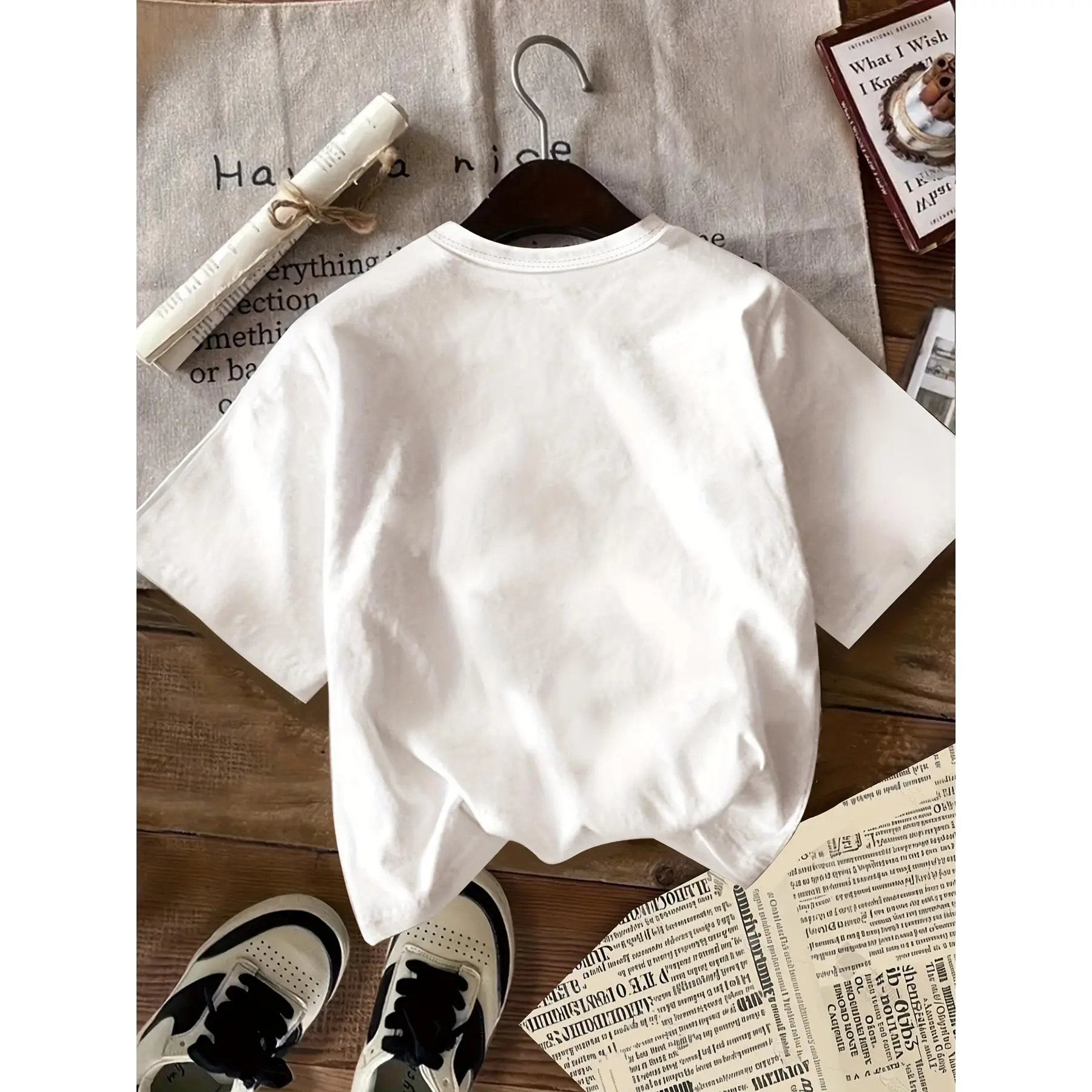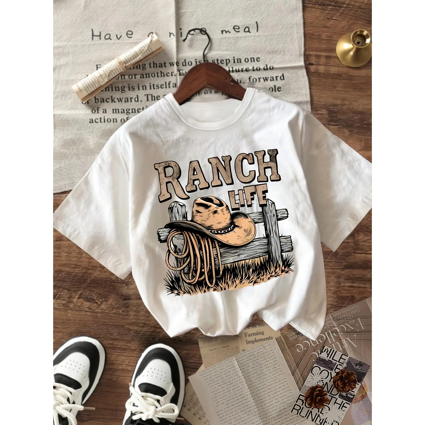 Western Retro "ranch Life" Cowboy Hat with Rope Fence Print Print Boys' Short-sleeved T-shirt, Soft and Stretchy Crew Neck Short-sleeved T-shirt for Boys, Best Choice for Summer, Boys' Clothing.