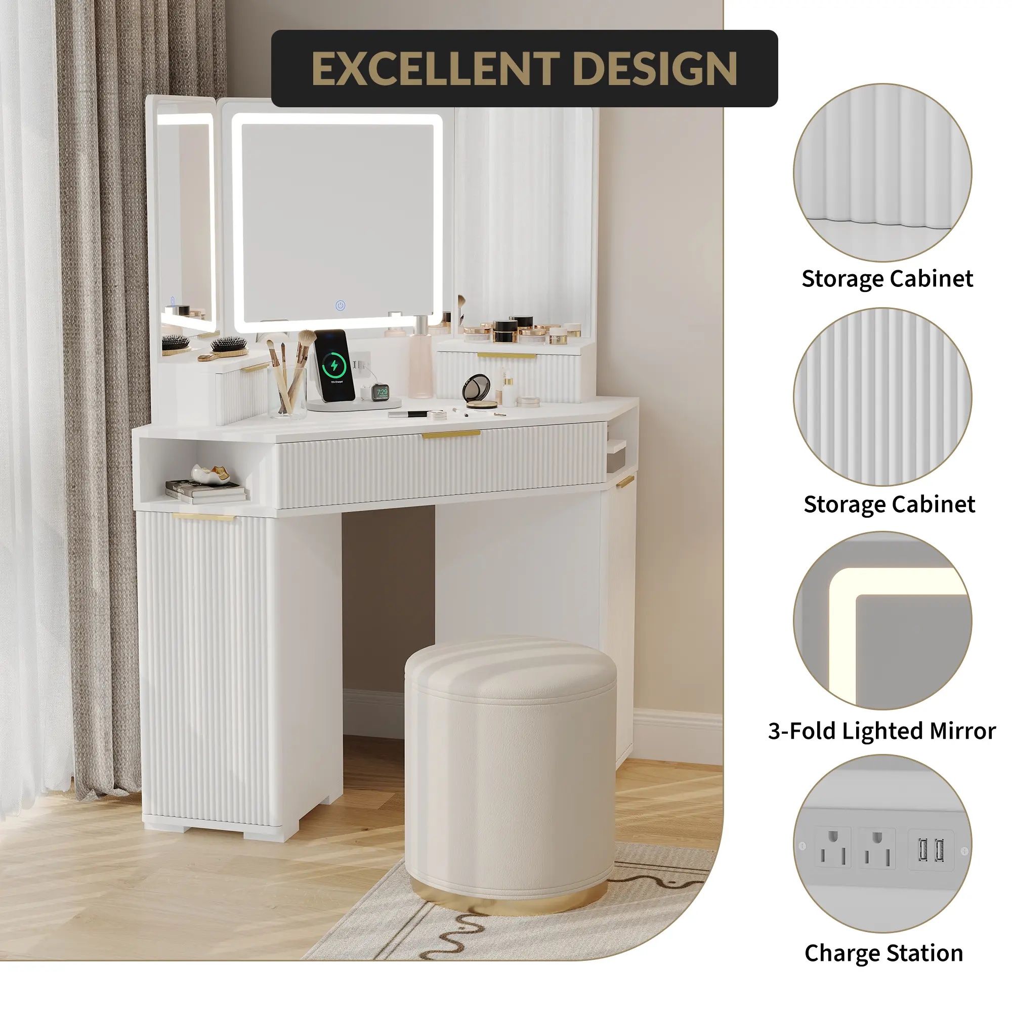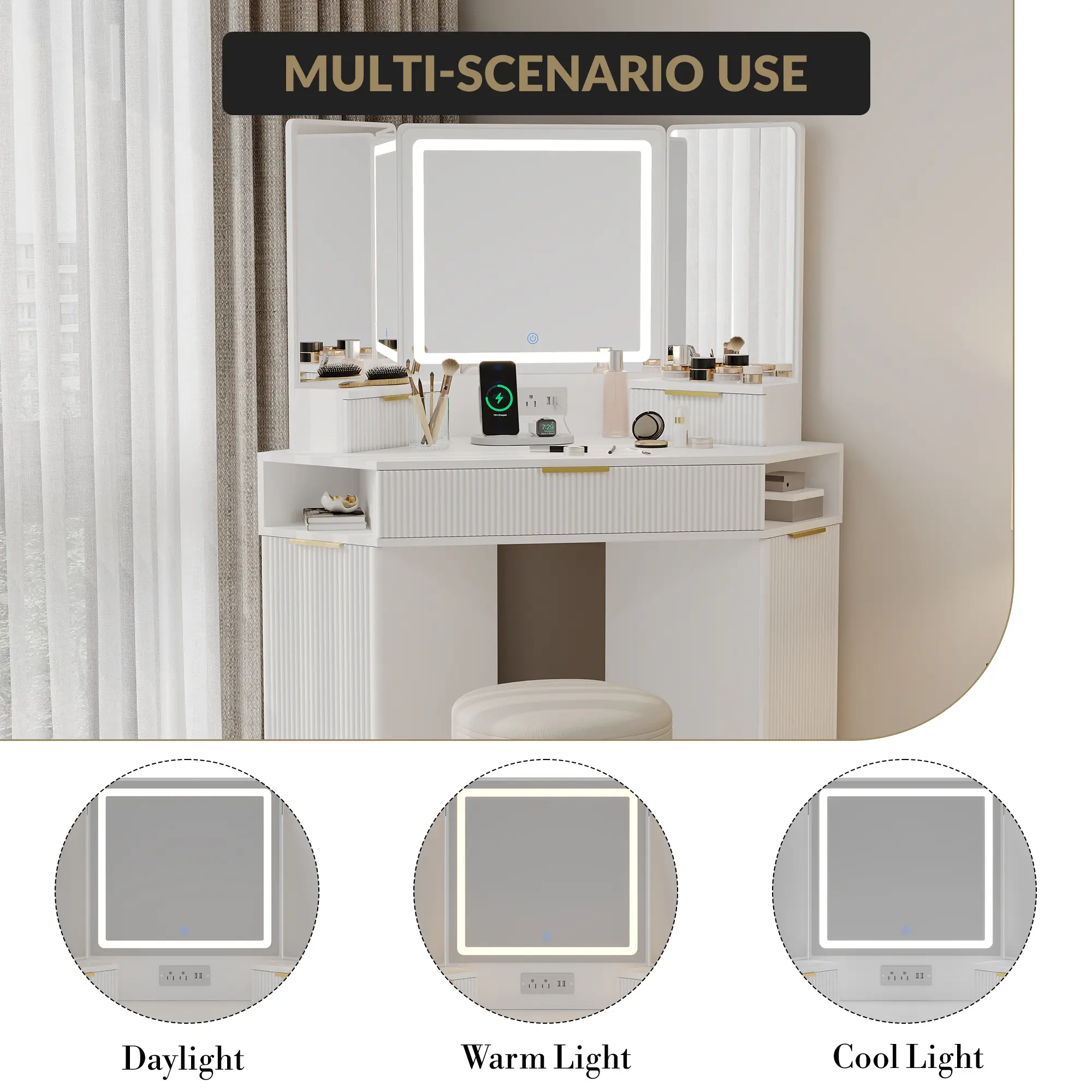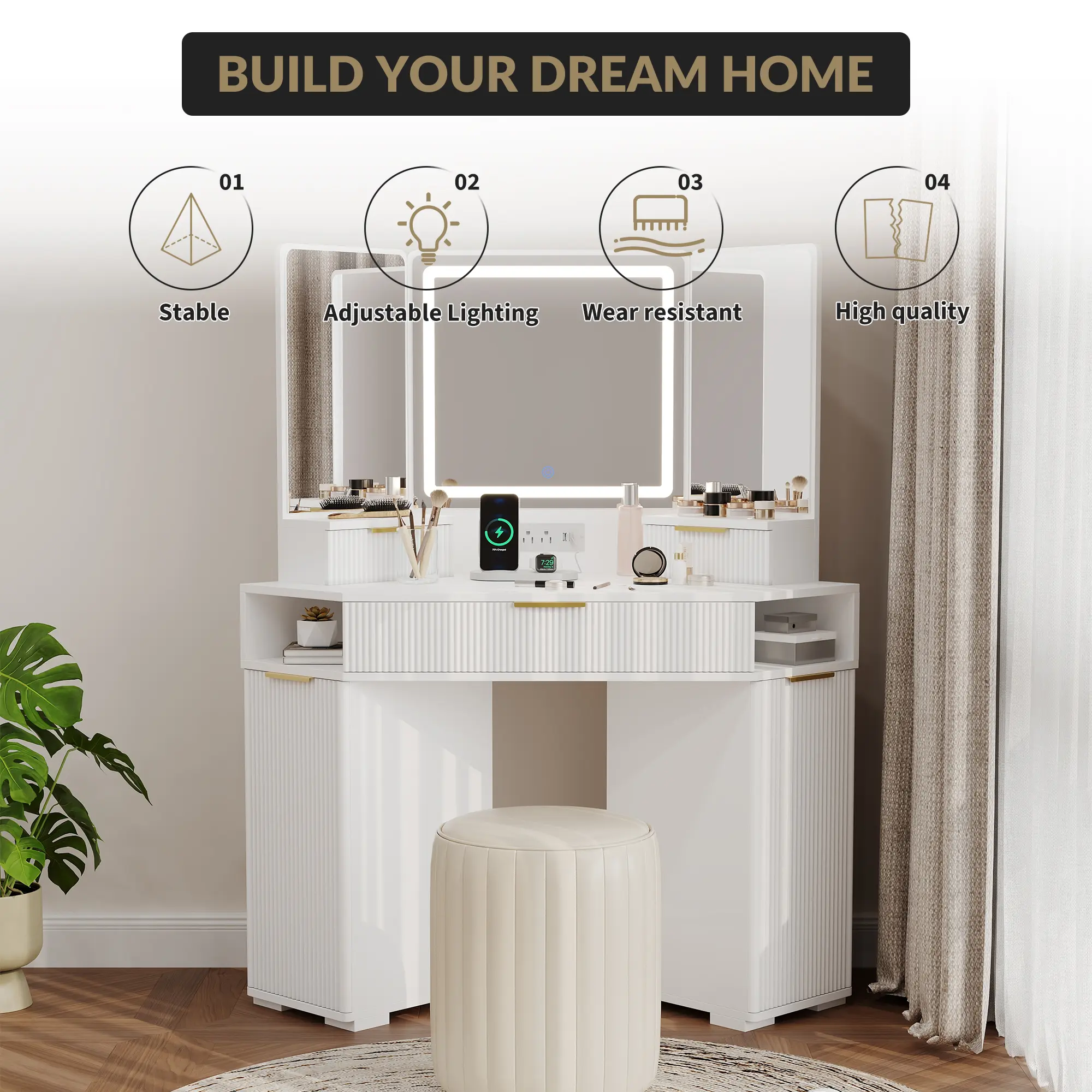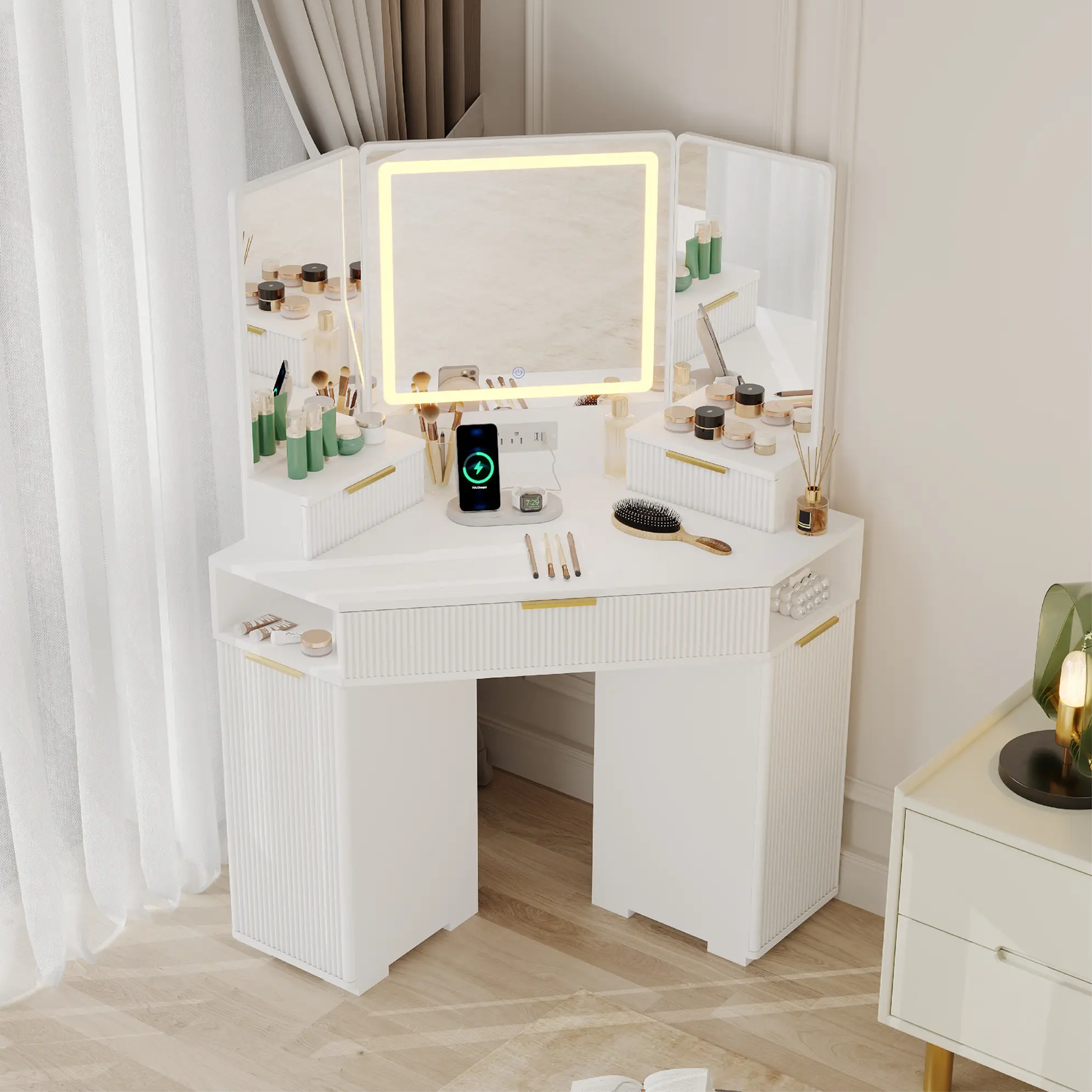 This **Corner Vanity Desk with Mirror and Lights** is a 48" fluted makeup vanity with drawers, charging station, cabinets, triple mirrors, and 3 color modes – perfect for bedrooms.