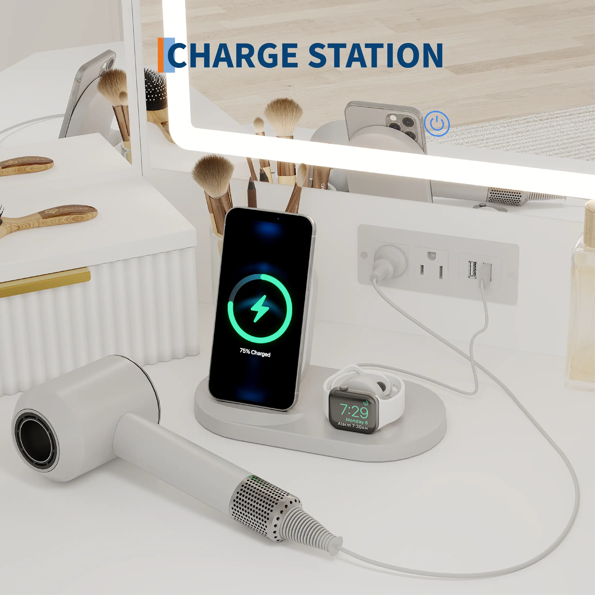 🔌 **Built-in Charging Station** – 2 USB ports + 2 AC outlets. Charge phone, hair tools, facial gadgets – all within reach.