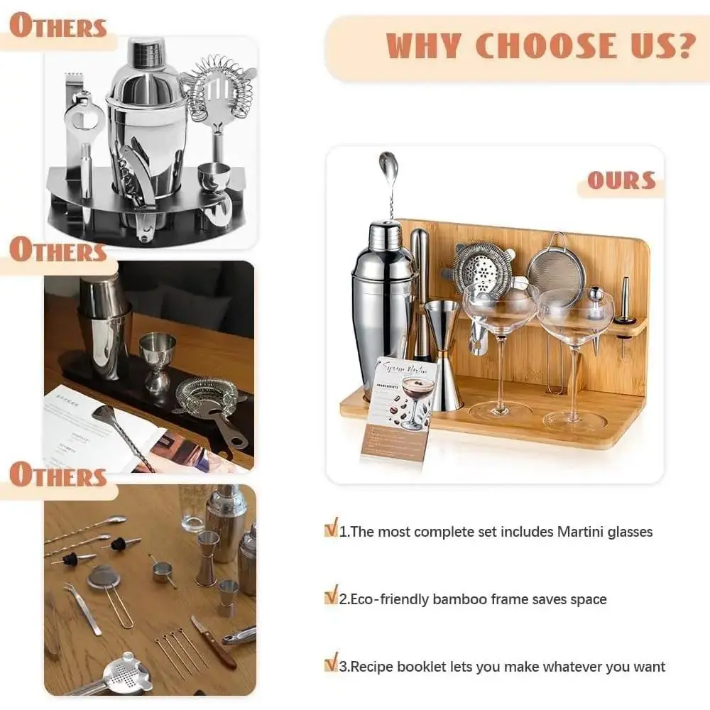[Complete 14- Essentials Bar Set]: USEERIL bartender kit includes everything you need to be a professional drink mixer at : shaker, Hawthorne strainer,fine mesh strainer(for Espresso Martini), bar spoon,double jigger, pourer, muddler for , bottle stopper, Stand,2pcs pick,recipe booklet,2 of Martini Glasses.Transform your bar with this comprehensive set, for parties and everyday use