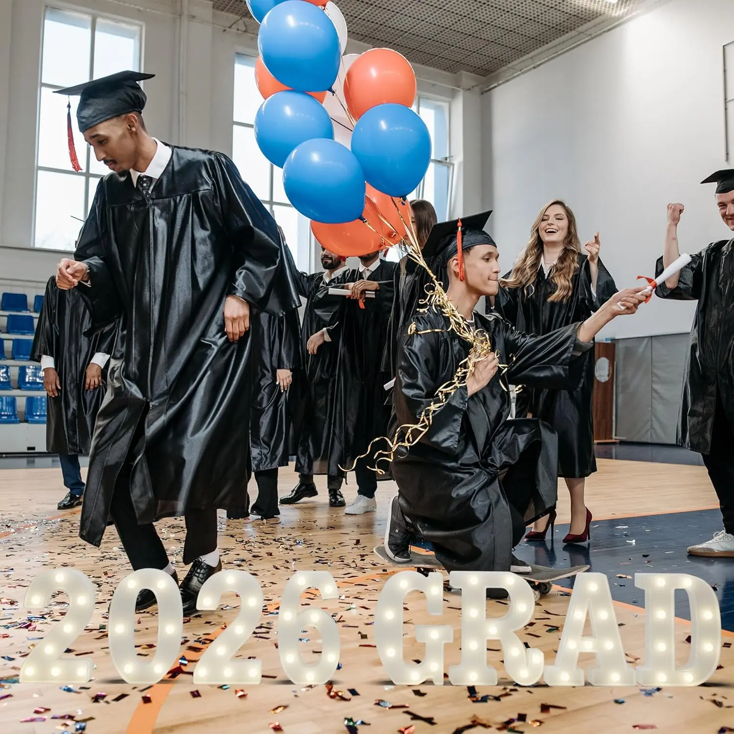 8 LED marquee light-up letters spelling out 'GRAD 2026' decoration.