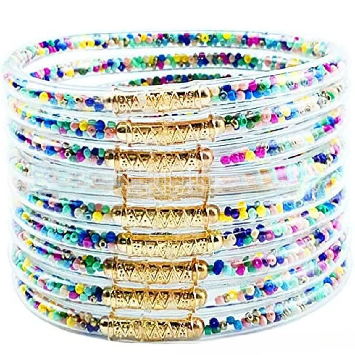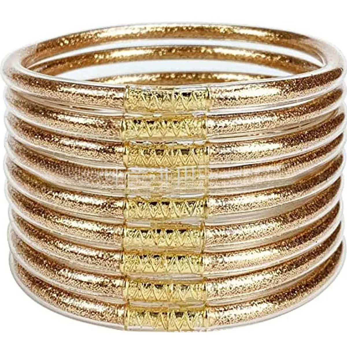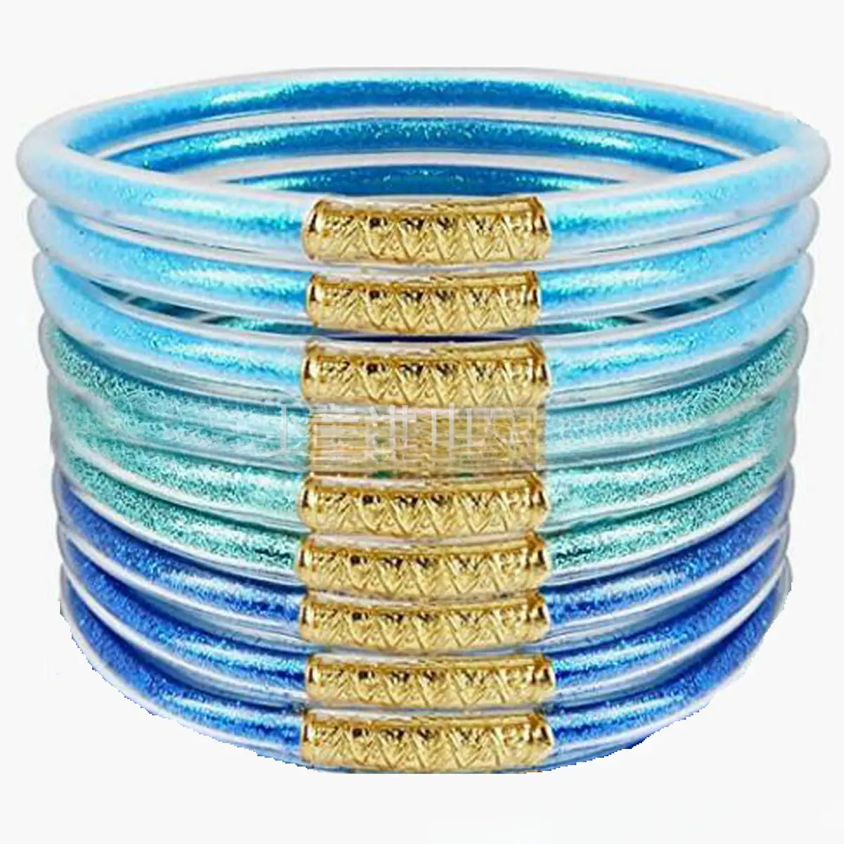 Jelly bangle bracelets for women is made of softsilicone material, durable and comfortable to wear, not easy to break and fade, bright color.beautiful shape,Whether you' re soaking up the sunshine on a beach, sightseeing on a city break or dancing tildawn at a festiva,it's time foryou to pile on the glitter filled jelly bangles bracelet.Wear them together or layer with other beach bracelets for a chic vibe.