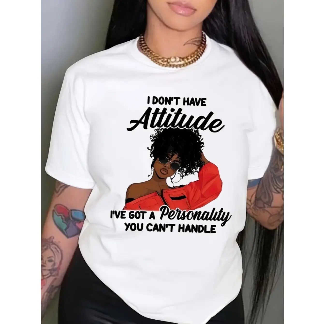 "Women's Graphic Print T-Shirt - Bold ""I Don't Have Attitude..."" Slogan & Red Fashion Glasses Design, Soft Breathable Fabric, Short Sleeve Round Neck Casual Top for Summer & Spring, Machine Washable "