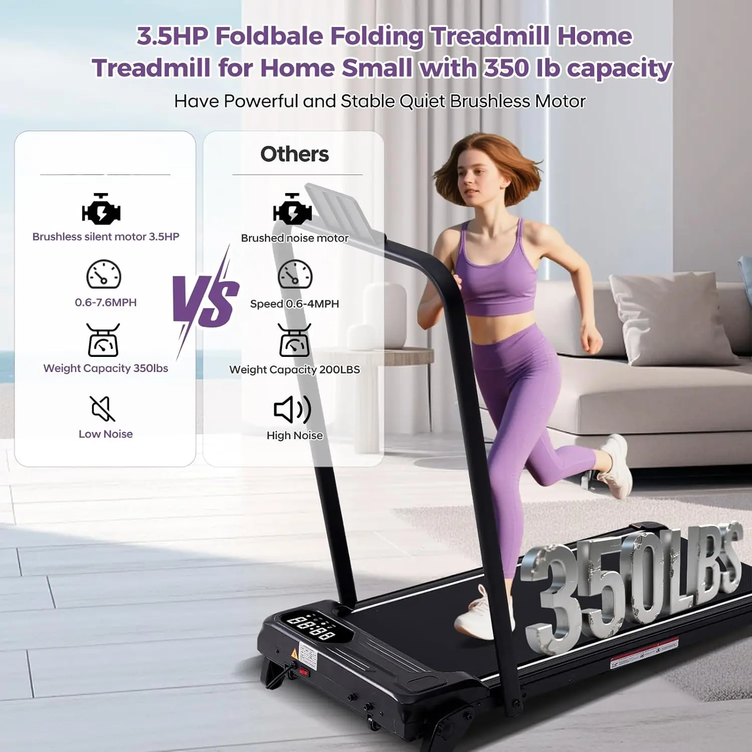 [High-End Performance in a Small Footprint]Designed for serious fitness, this treadmill with incline features a 3.5HP motor (quieter than market standards) with 0.6-7.6MPH speed control, perfect for varied workouts.Its 350LBS weight limit and oversized LED screen cater to small spaces without sacrificing performance.More robust, more versatile, and more space-smart: this is the treadmill that outperforms the rest.