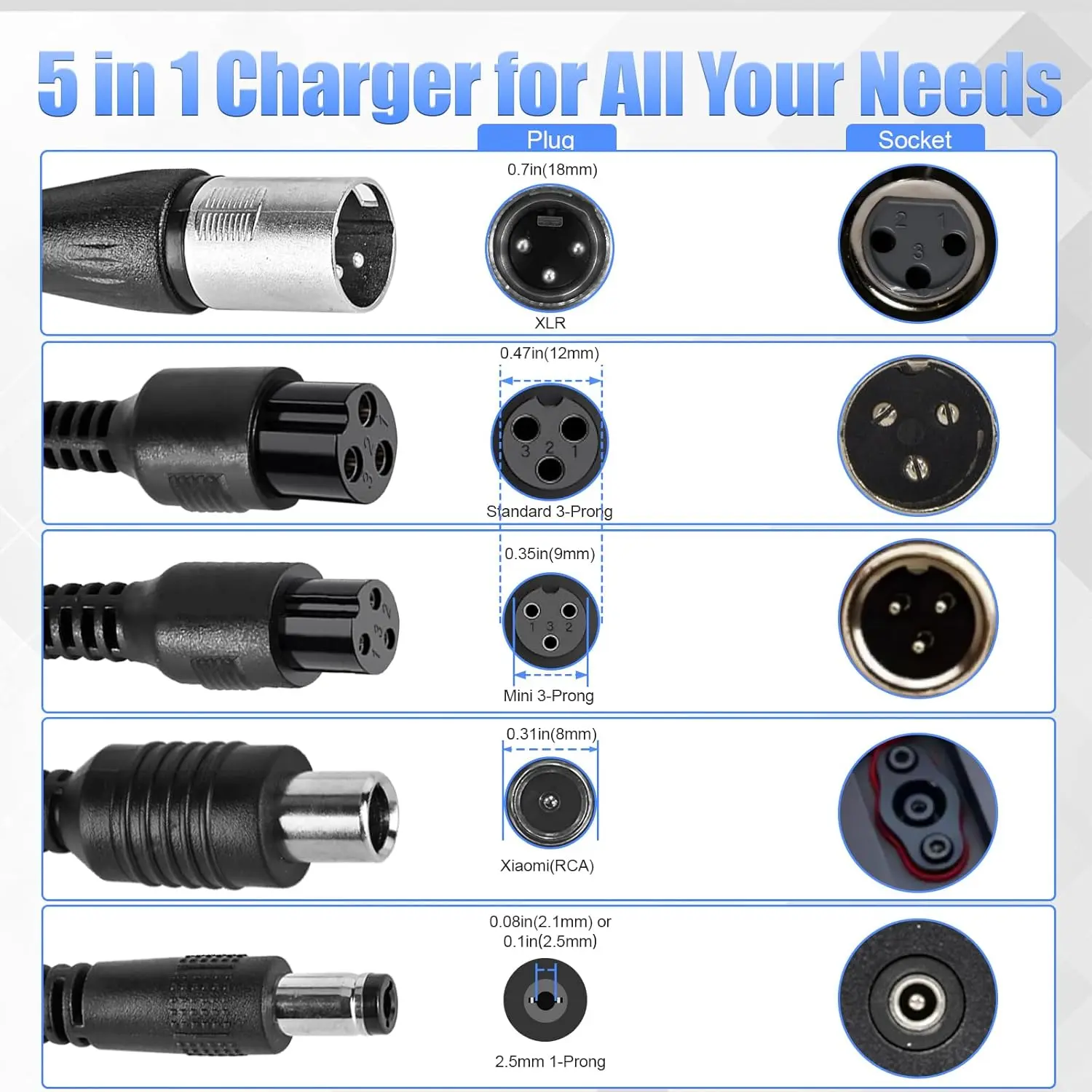 [5 Universal Connectors]Compatible with a wide range of electric scooters bikes ebikes on the market.Includes 5.5mm 1 prong, 8mm 3-prong, 12mm 3-prong, XLR plug, 9mm 1-pin