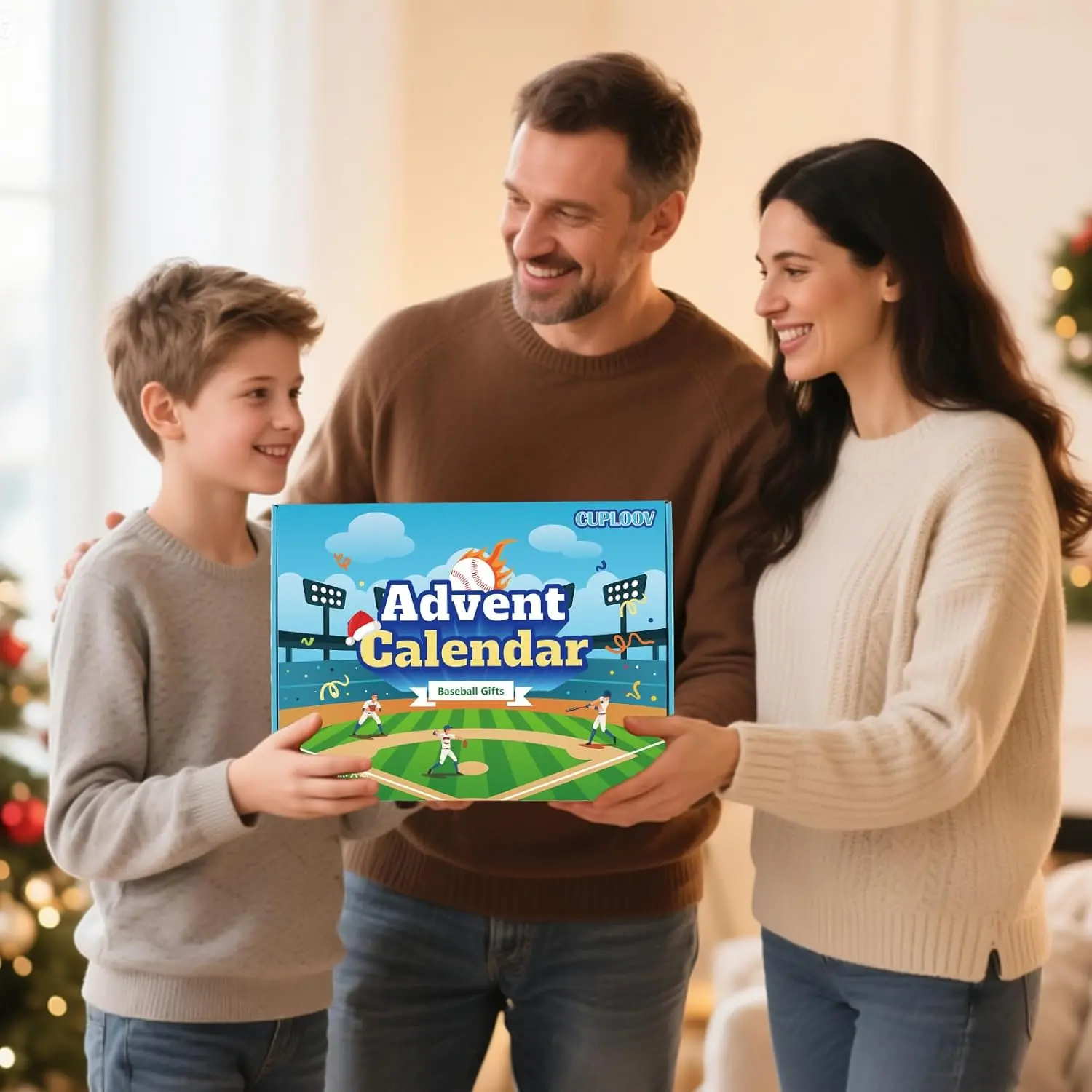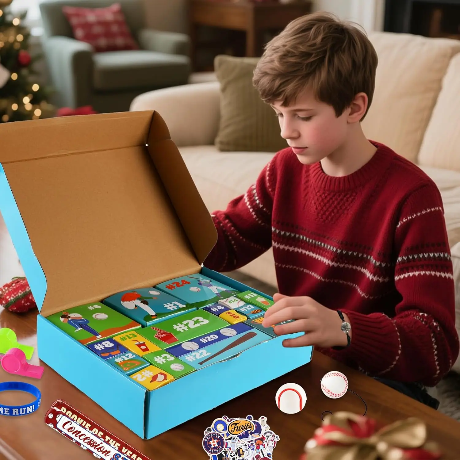 Product name: Baseball Advent Calendar Package include: Baseball Socks*3 pairs,Baseball wristbands*1 pair, Baseball bouncing balls*2pcs, Baseball toy*1pc, Baseball bracelets*4pcs, Baseball patterned quick drying towels*2pcs, Baseball eraser*1pc, Keychains*2pcs, Baseball tattoo stickers*1pack, Baseball stickers*1pack, Nylon double-Braided Rope Tornado Necklace*1pc, Large Inflatable Baseball Balloon*1pc, Whistles*2pcs (Random colors), Slap bracelets *2, Baseball Glove Wraps*1 pair Product material: Mixed material, plastic, silicone, cloth, polyester Features: Full of Christmas and baseball elements.