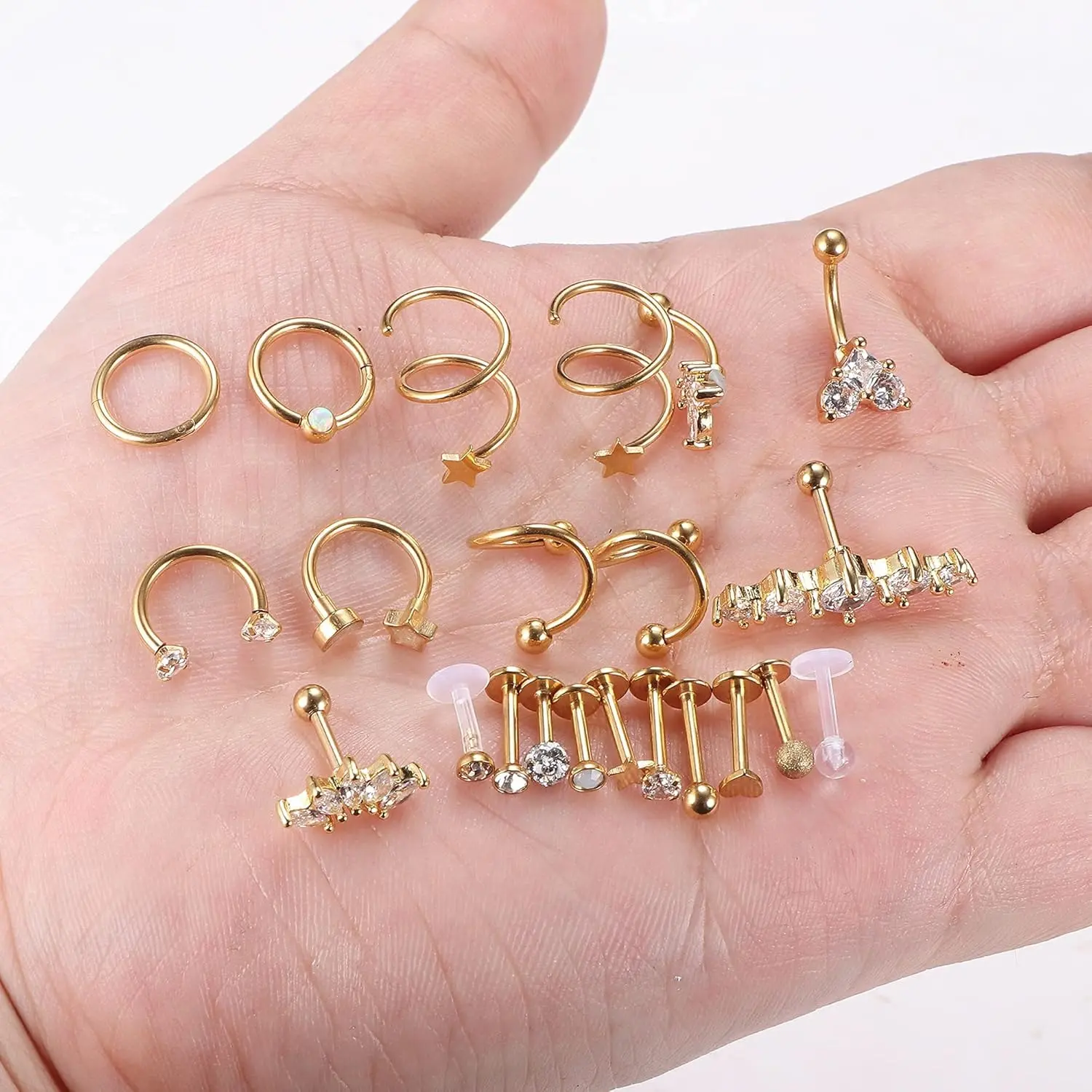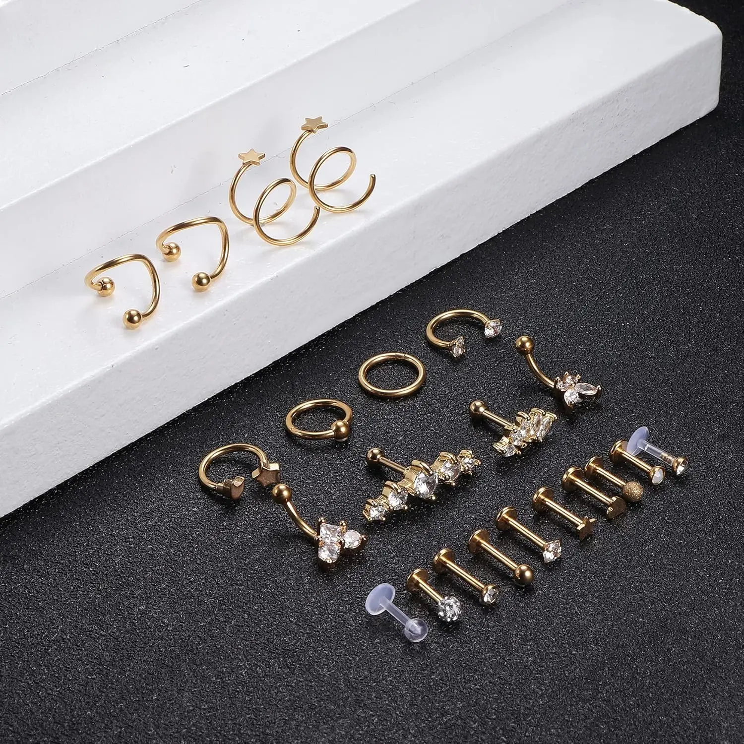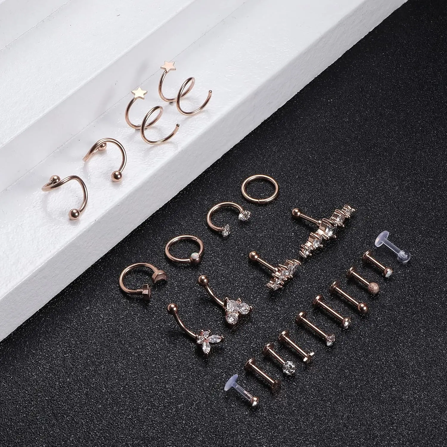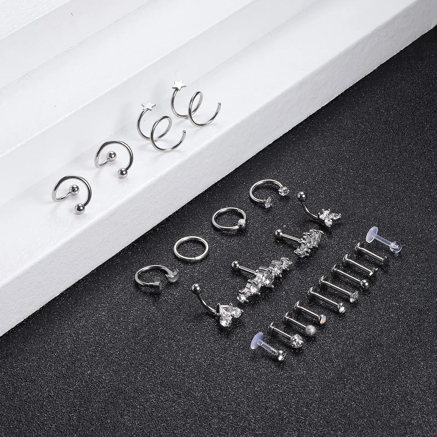 Ready for a complete ear or lip glow-up? Our 22-Piece Curated Piercing Set is designed to give you endless styling options. From minimalist studs to edgy spirals and classic hoops, this set is a full mood for your daily aesthetic!
