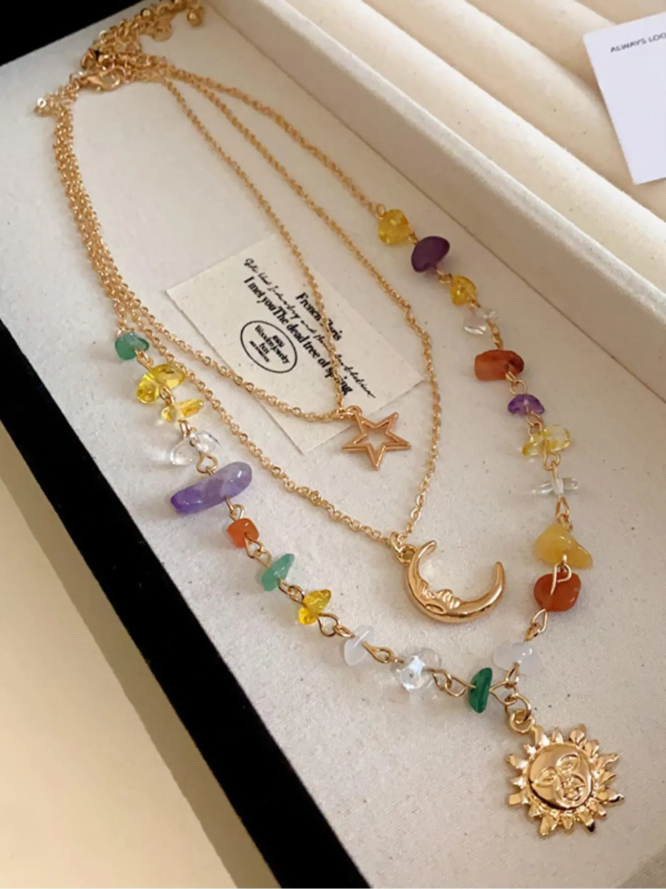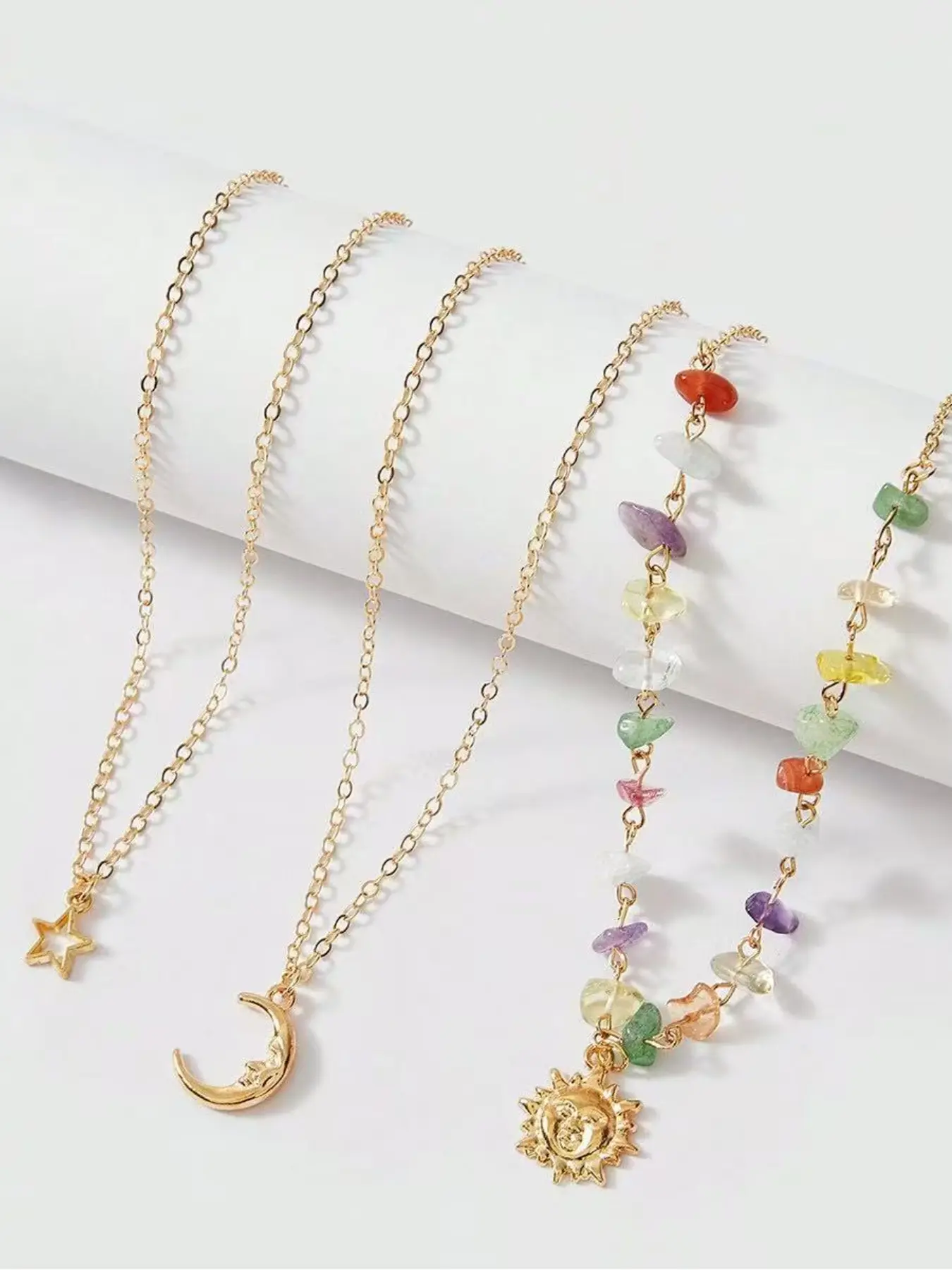 Boho 3 Layered Sun Moon Star Necklace for Women, 7 Chakra Healing Crystal Beaded Pendant Necklace, Bohemian Gold Layered Necklace, Summer Beach Jewelry Gift for Her