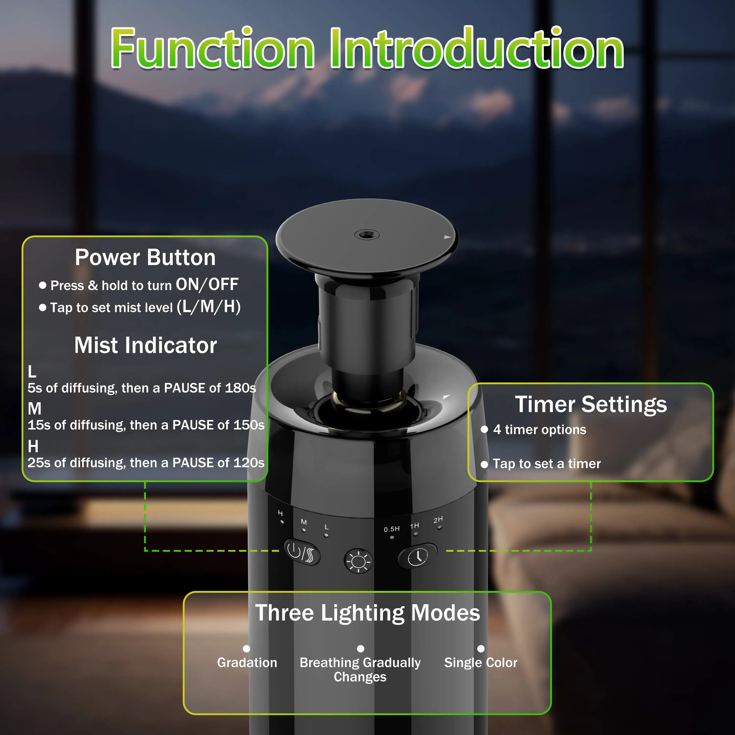 Smart Control System: The waterless aroma diffusers are customized with 4 timers (0.5H/1H/2H/4H) and 3 intermittent mist modes (H: 30s/120s pause; M: 15s/150s; L: 5s/180s). Perfect for sleep/work/yoga/reed.