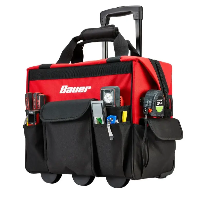 This BAUER 18 in. Roller Tool Bag offers a durable, secure design for transporting up to 100 lb. of tools and hardware. 13-pocket design with 20 daisy chain holder for keeping tools organized. Rugged 600 denier tear-resistant fabric withstands jobsite abuse without ripping.
